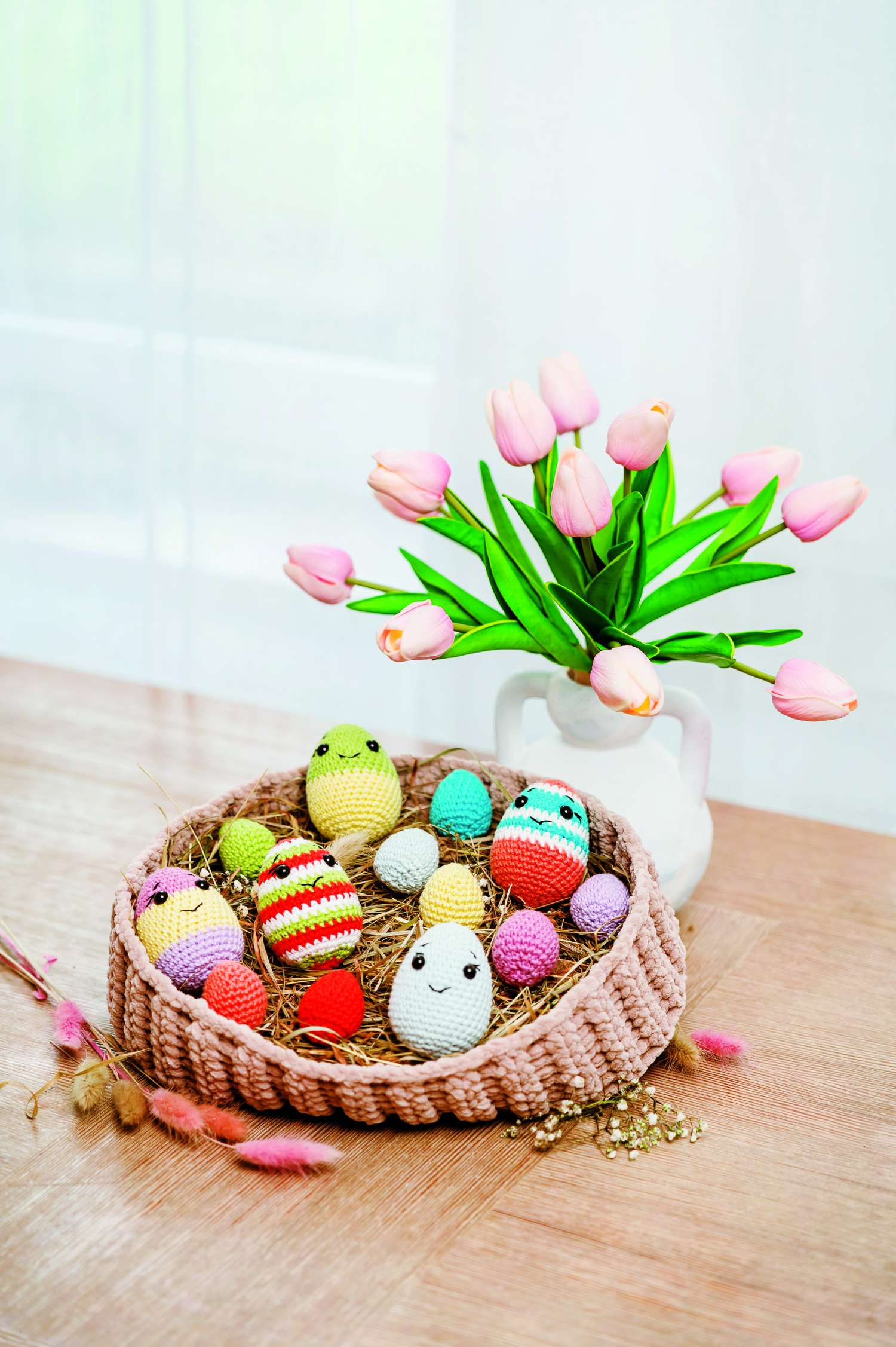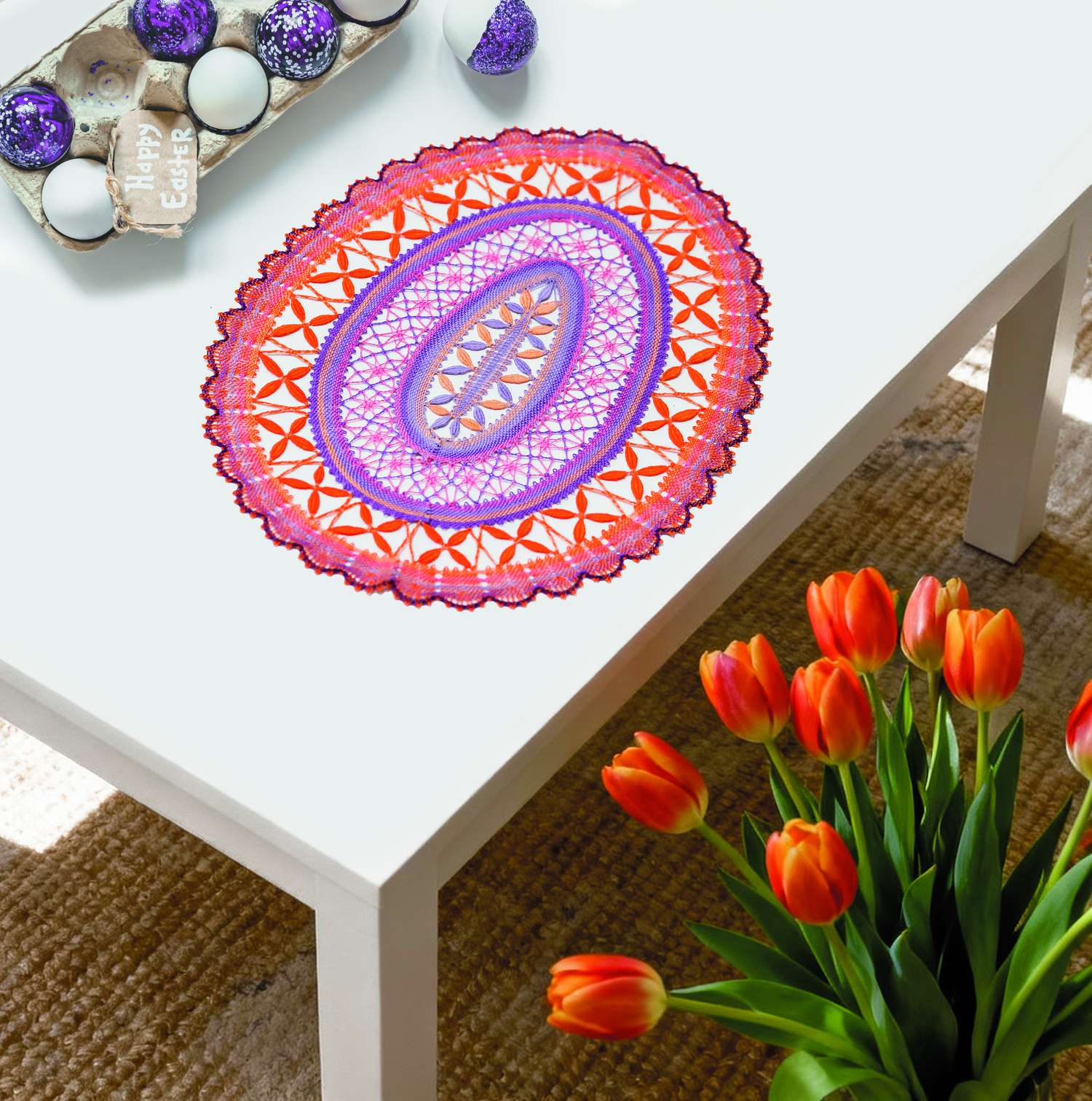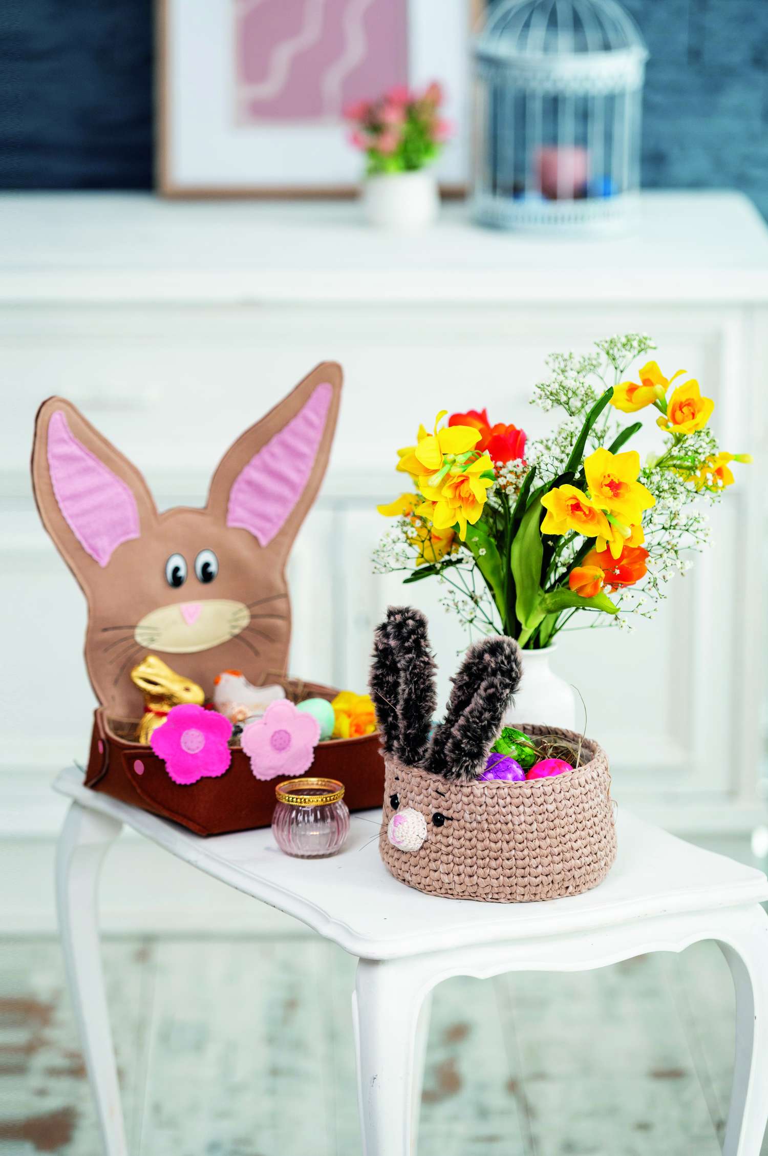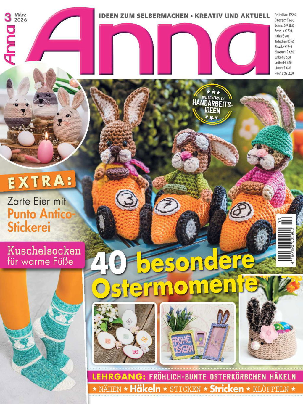 Der Frühling naht und das Osterfest steht auch wieder vor der Tür. Völlig verrückt und lustig sind die gehäkelten Hasen in ihren Rennautos. Gehäkelt, genäht und appliziert werden die kreativen Hasennester. Hier passen schöne Überraschungen für Ostern rein. Für die Technikbegeisterten erklären wir die traditionelle Technik der Punto Antico-Stickerei, in der ein Leinensäckchen, ein Duftkissen und fünf Ostereier in Perfektion gestaltet wurden. Es gehört einfach dazu, unser Zuhause mit allerlei Eier-Varianten zu schmücken. Die kleinen und großen gehäkelten Eierköpfe bringen jeden zum Schmunzeln. Noch einmal kuschelig wird es mit den gestrickten Socken mit Hasenmotiven in der Norwegertechnik. Wie wäre es mal mit gehäkelten Bilderrahmen? Sie bringen Stimmung in dein Heim und eignen sich hervorragend als Geschenk. Die Klöppel-Fans finden hier eine Anleitung für ein zartes Osterdeckchen in Lila und Orange. Im Modestrickteil findest du bezaubernde Modelle in harmonischen Tönen für den Frühling. Dies und vieles mehr findest du in dieser Ausgabe von Anna Handarbeiten. Viel Spaß bei deinen neuen Projekten!