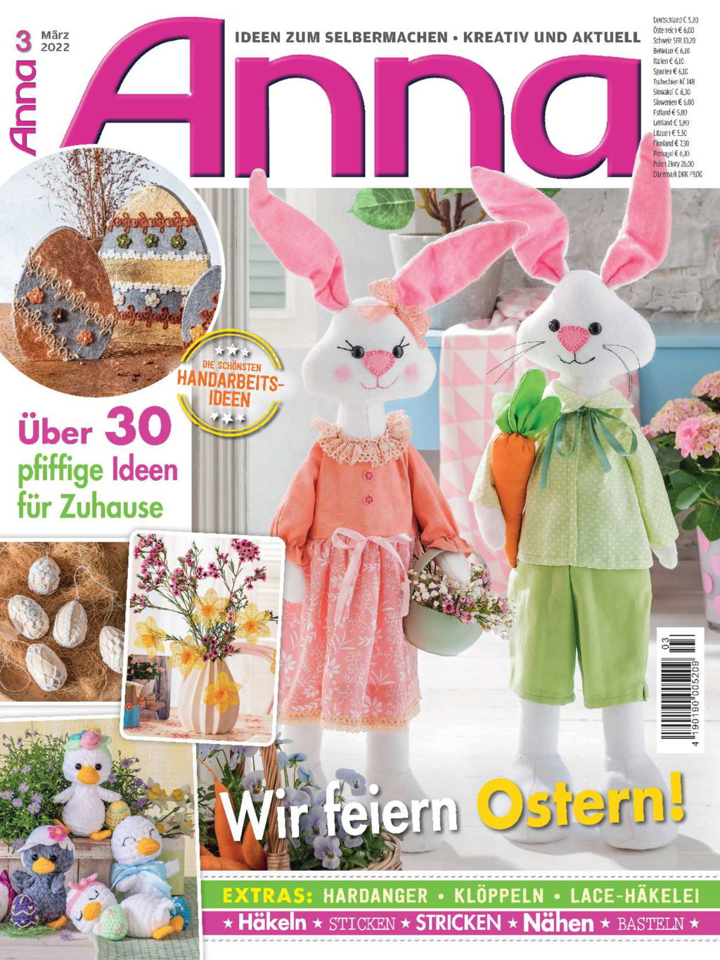 Der Frühling ist da und Ostern steht vor der Tür. Zum perfekten Osterfest gehört es, die Wohnung mit Eiern zu dekorieren. In Naturtönen umhäkelt oder mit Betonpaste umhüllt, sind sie mit Blattgold, Häkelborten und Accessoires verziert. Und ans Fenster kommen bunte Strickschlauch-Eier, ergänzt mit gehäkelten Hasen, Küken und Blüten. Ganz besonders erfrischend sind die fröhlichen Entenküken, die ihr eigenes Osterei überwachen. Auch Osterhasen dürfen jetzt nicht fehlen. Ob gestrickt mit raffiniertem Kleid für die Eier, aufgenäht auf einem Wimpel oder genäht als lustige Standfiguren im stylischen pastellfarbenen Outfit. Die Erfolgsautorin Veronika Hug überrascht uns diesmal mit einer kuschligen Badedecke in Hasenform aus der FROTTEE XL von Woolly Hugs. Im Lehrgang gibt es einen Grundkurs für kunstvolle Lace-Eier. Hauchzarte Häkelspitzen lassen trendige Nostalgie bei dir einziehen. Für einen perfekten Tisch sorgen die Mitteldecken, einmal in Hardanger-Technik, einmal bestickt. In kräftigen Lehm- und Ziegeltönen zeigen sich die eleganten und leichten Strickmodelle der Firma LANGYARNS. Ein echter Hingucker ist die Tasche des Monats aus der ROPE-Garn. Den Super-Nähspass gibt es mit Annabell. Hier entstehen aus buntem Filz lustige Geschenktäschchen. Zum Klöppeln sind die Frühblüher von Ina Meinhold und strahlen in kräftigem Gelb. Da sagen wir doch einfach mal, Ostern kann kommen.