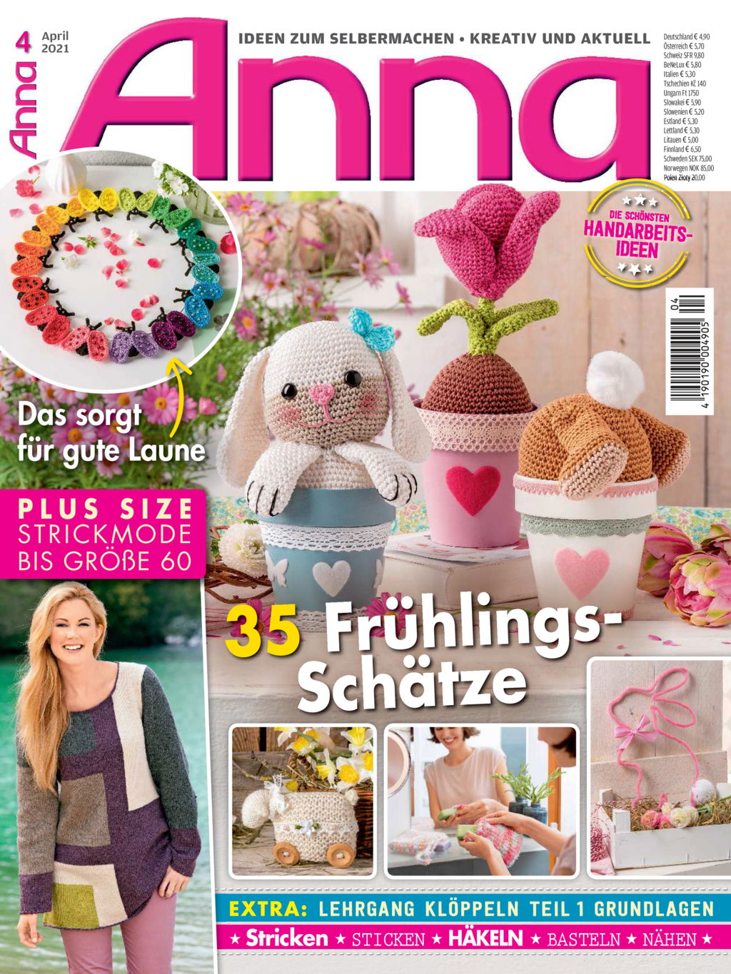 Mit diesen kreativen Handarbeitsideen kommt neuer Schwung in dein Leben und dein Heim. Starte kopfüber in eine schnelle Osterdeko mit originellen Hasen, einer Tulpe im Topf oder putzigen Schäfchen. Für ein erfrischendes Frühlingsflair sorgen bunte Blüten und niedliche Käfer. Mit den selbst gestrickten und gehäkelten Saubermachern liegst du voll im Trend. Im Modestrickteil findest du modische und figurschmeichelnde Pullover bis Größe 60. Diese und viele weitere Kreativ-Ideen findest du in dieser Anna.