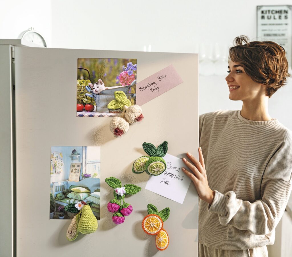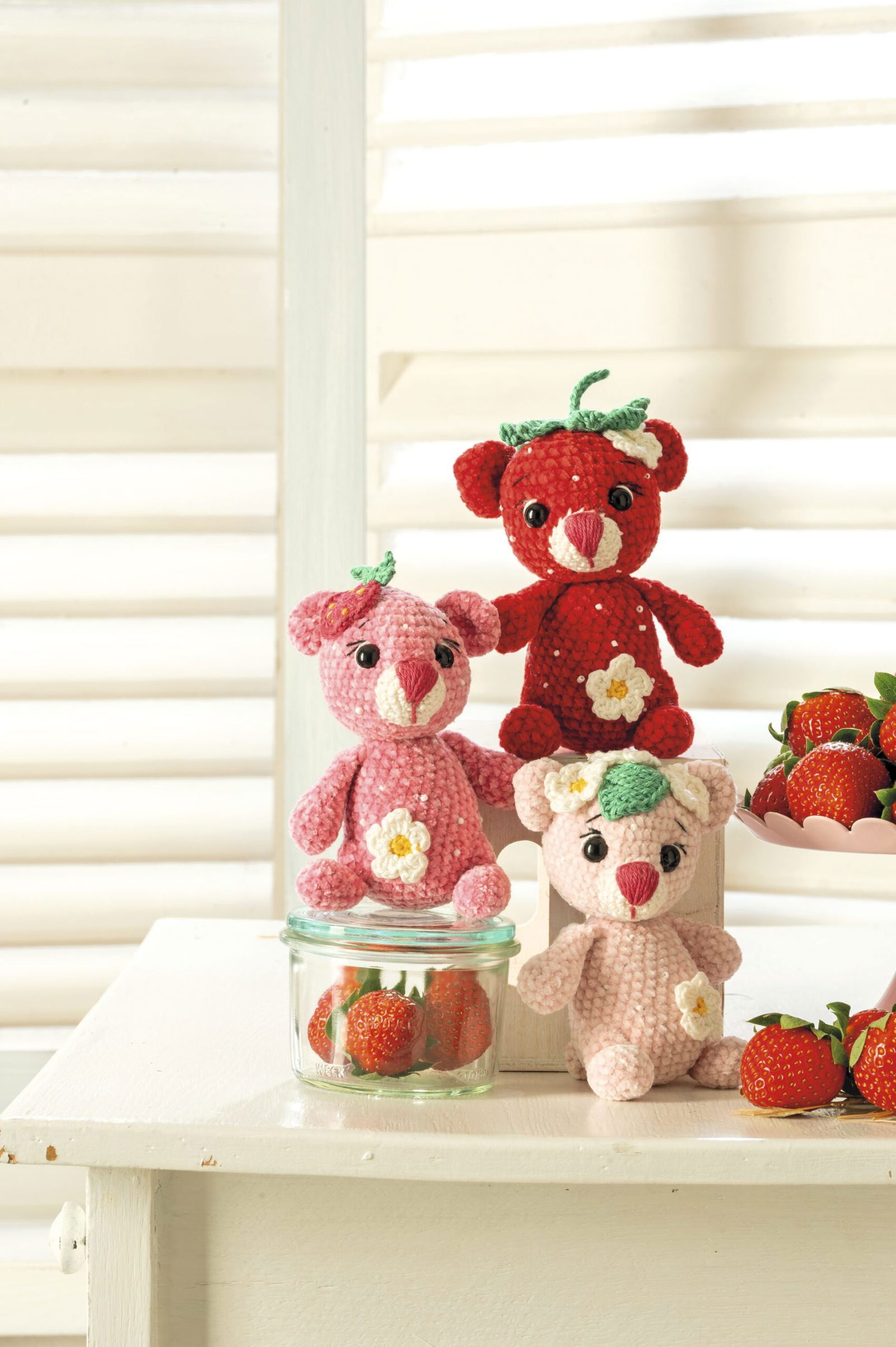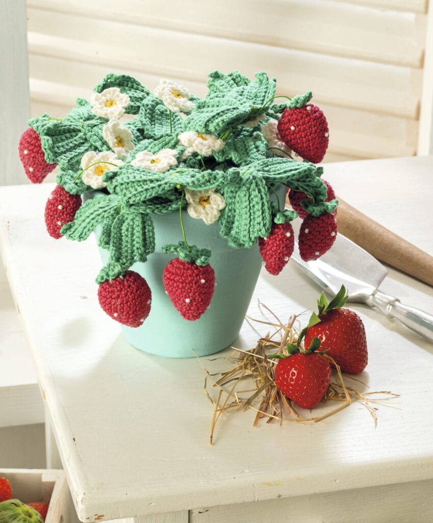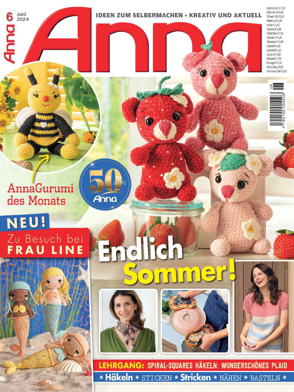 Die niedliche Bärchen-Bande freut sich schon auf die leckeren Erdbeeren, die jetzt besonders gut schmecken. In dieser Ausgabe von Anna findest du die süßen Früchtchen in Form eines Mobiles, einem Kissenbezug und in einem dekorativen Töpfchen. Unser AnnaGurumi des Monats ist das fleißige Bienchen Tilli. Ganz bezaubernd sind die drei Meerjungfrauen von Frau Line in unserer neuen Rubrik. Modisch wird es mit einem gestrickten Scarf und den sommerlich-leichten Strickmodellen. Lässig unterwegs bist du mit der farbenfrohen Henkeltasche im Wiener-Geflecht. Im Lehrgang wird ein Plaid aus Spiral-Squares gehäkelt. Für die Nähbegeisterten kommen aus floralen Stoffen Topflappen im Schmetterlings-Design angeflattert. Mit ganz viel Liebe zum Detail werden echte Hingucker genäht: ein Klammerbeutel mitsamt Vögelchen sowie eine süße Kinderschürze. Fruchtig und bunt wird es mit den Kühlschrank-Magneten und mit Apfel und Orange. Diese Früchte bewahren eine echte Überraschung. Für alle Katzen-Fans gibt es ein schönes Kissen, in Silhouetten-Optik gestrickt. Verwandle einfache Steine in kleine Kunstwerke, in dem du sie umhäkelst oder bemalst. Unser Lieblingsmodell von Veronika Hug sind lustige Minisocken für Zehensandalen. Wir wünschen viel Freude und Spaß beim Handarbeiten!