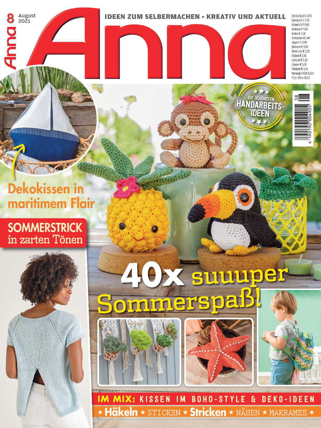 Das versetzt uns jetzt in Sommerlaune. Ein mottogerecht dekorierter Tisch für die Grillparty mit vielfältigen Ananas-Accessoires wie Glasmarkierern, Besteckgläsern, Teelichten und Untersetzern. Die frische Brise mit Schiffen und Fischen wirkt wie ein Tag am Meer und sorgt für ein maritimes Ambiente. Auch die beiden Kissen in Form von Seesternen passen hervorragend dazu. Maschenspaß mit Vitaminkick versprüht die gestrickte Auswahl an Äpfeln, Pflaumen, Kirschen, Trauben, Birne und Orange. In dieser Ausgabe kommt der angesagte Boho-Style nicht zu kurz. Im Lehrgang präsentiert sich ein Kissen mit strukturstarkem Häkelmuster im Hippie-Chic. Der imposante Makramee-Wandbehang verwandelt Dein Zuhause in ein gemütliches Boho-Paradies. Die kleine Meerjungfrau zeigt sich in einem traumhaften Schuppenkleid in Form einer Puppe, einem Rucksack und einem Flaschenhalter und lässt die Herzen kleiner Kinder höher schlagen. Leichte Sommermaschen kommen im Modestrickteil in zarten Pastelltönen bestens zur Geltung. Die Designer überzeugen zudem mit klaren Linien und gekonnt platzierten Details.