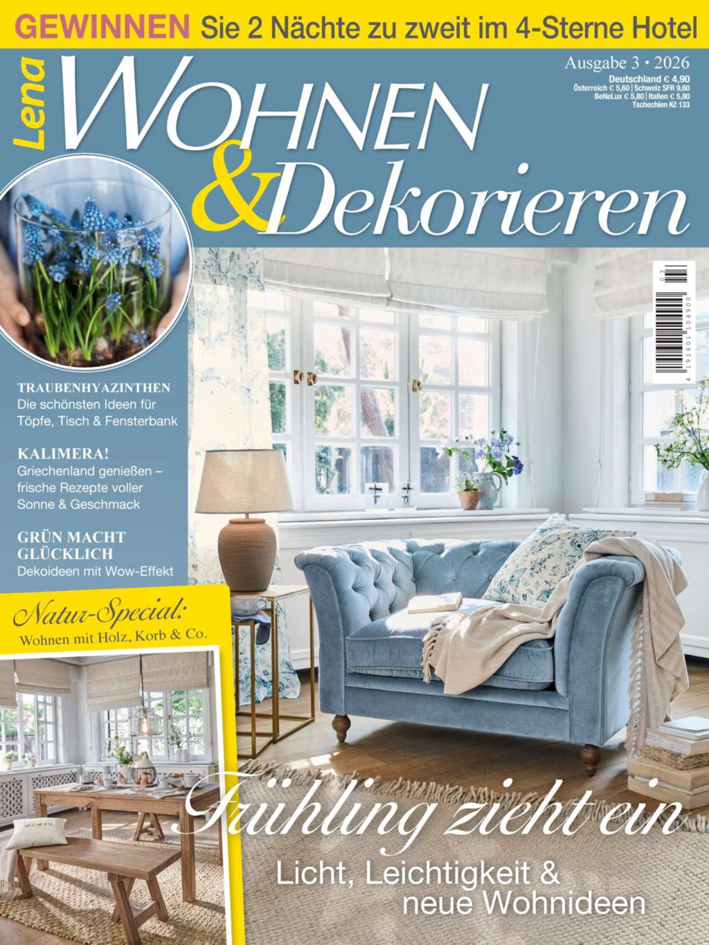 Auf 84 Seiten erfahrt ihr alles, um euer Heim noch schöner zu gestalten. Ein Blumenstrauß hier, ein bisschen Farbe dort – und schon wirkt alles gleich ein wenig frischer! In dieser Ausgabe lassen wir Grün den Ton angeben. Diese Farbe bringt Ruhe, Tiefe und ein kleines bisschen Naturgefühl in jeden Raum. Dazu schenkt Flora uns die ersten Frühlingsboten, mit denen wir unser Zuhause dekorieren können: Traubenhyazinthen, Obstblüten und duftende Kräuter machen Lust auf längere Tage und offene Fenster. Außerdem sind Rezepte und Tipps für die Gestaltung eines Frühlingsfestes mit dabei.