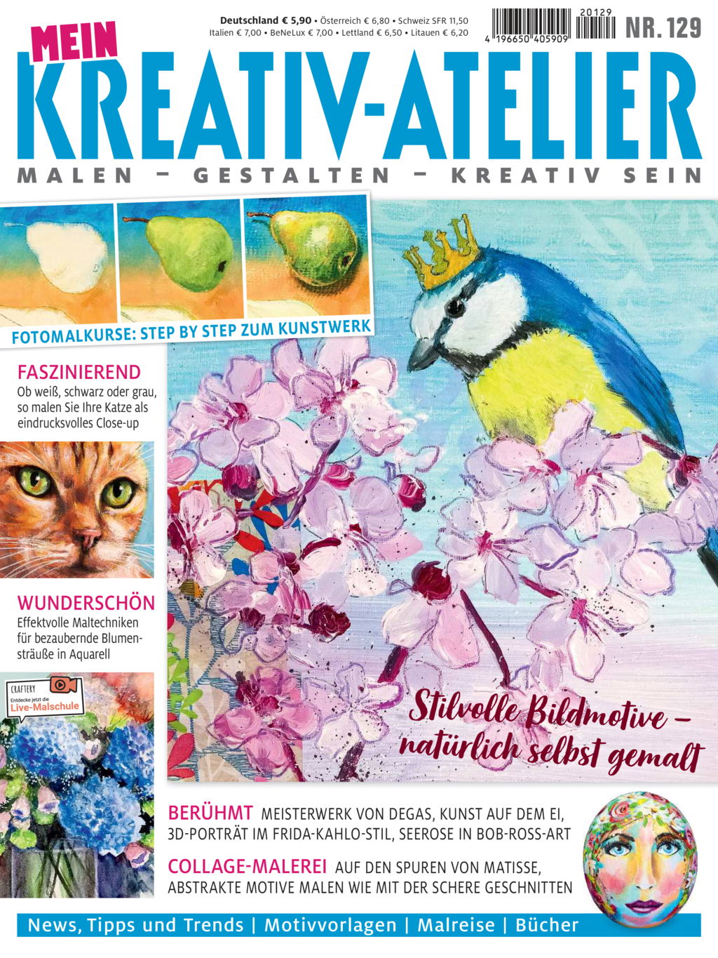 Wir begrüßen dich in dieser Ausgabe von Mein Kreativ-Atelier mit einem ganzen Strauß an frischen, kreativen Ideen. Anja Gensert lädt dich zu einer Teilnahme am Workshop Aquarellmalerei Blumensträuße ein. Ob Pfingstrosen, Ranunkeln oder Hortensien, es ist faszinierend, wie mit dem Pinsel und den fließenden Eigenschaften von Wasser und Aquarellfarben effektvolle Stillleben entstehen. Wer möchte, kann ergänzend dazu in der Live-Malschule online unter Anleitung der Künstlerin sein individuelles Blumenkunstwerk malen. Ein weiteres Highlight ist sicher die nach Bob-Ross-Art gemalte Seerose. Thomas Boehler widmet sich ganz dem Thema Katzenportraits, auch hier dargestellt als ausdrucksvolle Close-ups in Acrylfarben. Und natürlich haben wir auch nicht vergessen, dass Ostern vor der Tür steht. Dafür haben wir eine ganz besondere Idee für dich. Kunst auf dem Ei wird dir Schritt für Schritt von Judith Schwibinger-Becker erklärt. Sie verzaubert ein Straußenei mit einem Frauenportrait im angesagten Frida-Kahlo-Stil. In unserer Rubrik Berühmte Künstler tritt Edgar Degas mit seinen Vier Ballerinas auf der Bühne auf. Claudia Ackermann zeigt dir, wie du mit selbstgemachten Linolstempeln ein fröhliches Hühnerquartett auf Papier bringst. Selbstverständlich gibt es wieder für alle Motive unsere beliebten Vorlagen. Werde kreativ und lass dich inspirieren!