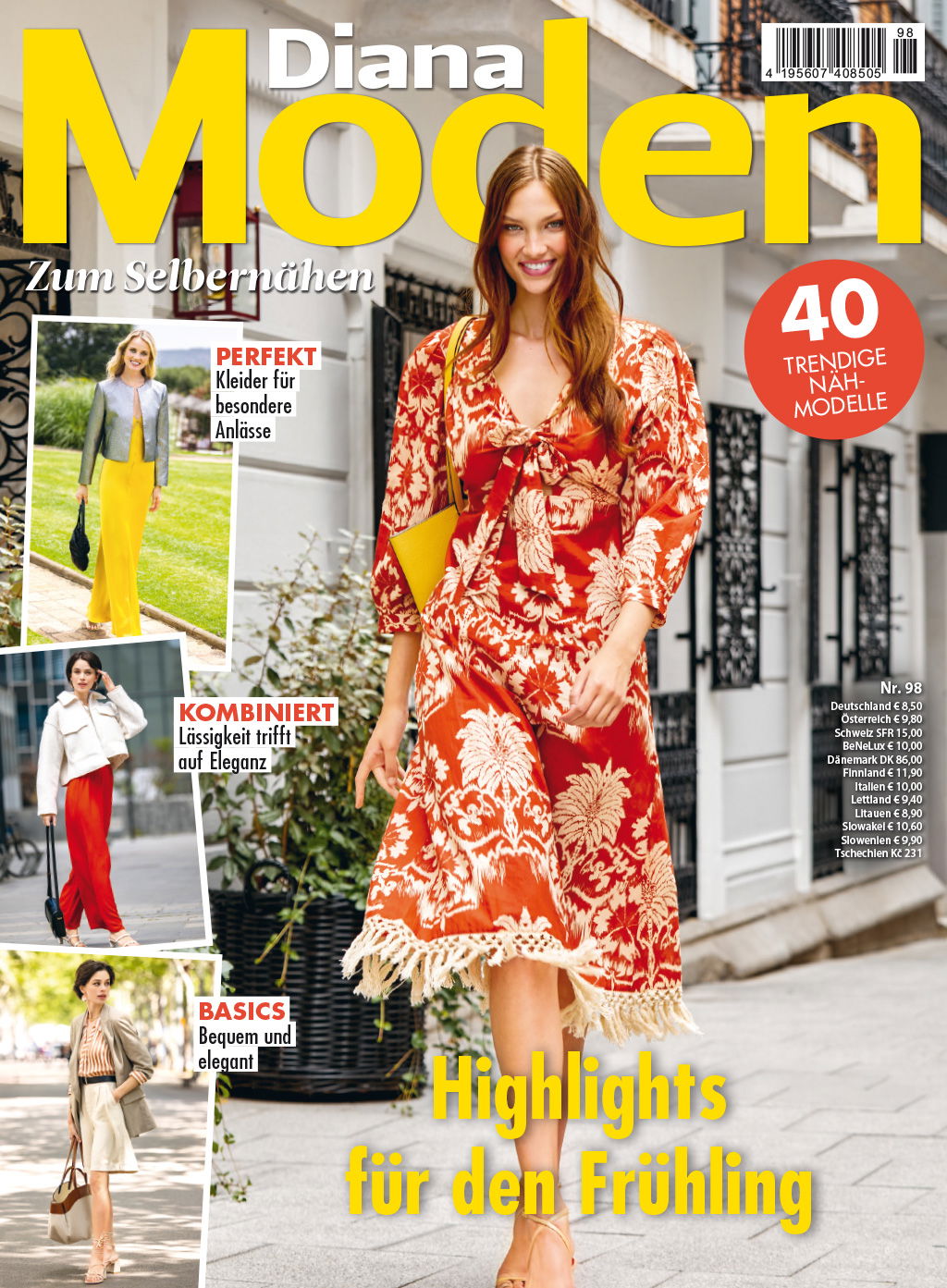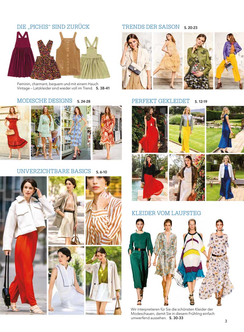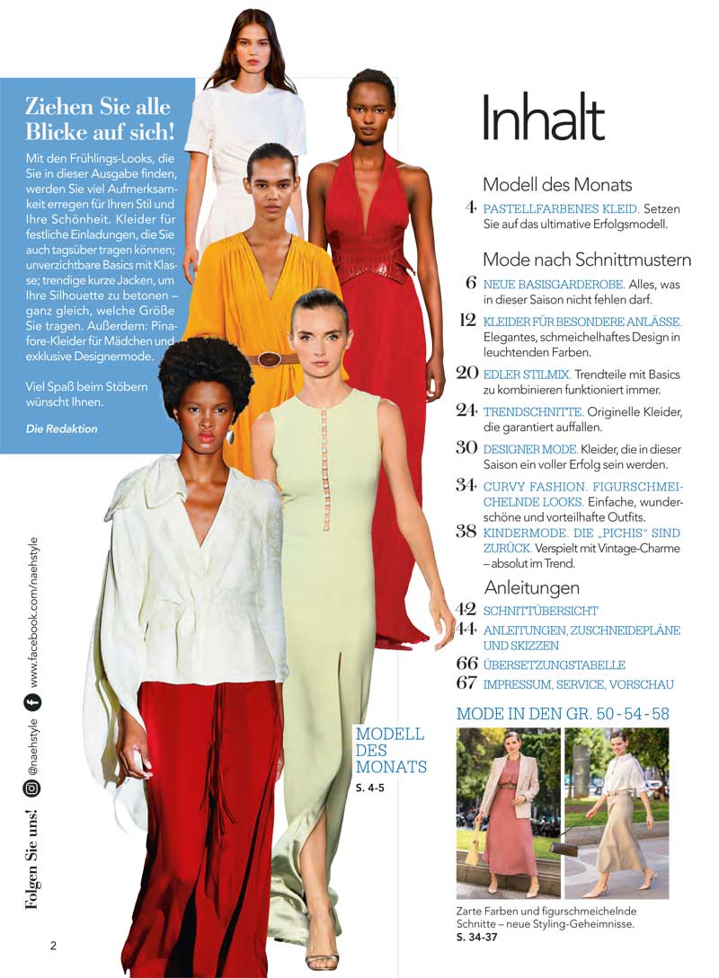 In diesem Frühling wird es in der Modewelt sehr spannend und abwechslungsreich. Es erwarten dich in dieser Ausgabe von Diana Moden schicke, elegante Kombis. Ideal fürs Büro oder den Bummel durch die Stadt. Ideal für diese Jahreszeit sind leichte Mäntel, egal ob lang oder kurz, Blazer oder kurze Jacken. Sie passen perfekt zu Kleidern oder Hosen. Für besondere Auftritte gibt es ein aufregendes rotes Kleid und eines in satinblauem Satin. Klassische Mode gefällt durch ihre zarten Töne, junge Mode durch auffällige Schnitte und kräftige Farben. Aber auch romantische Kleider dürfen in deiner Garderobe nicht fehlen. Sie sind leicht und lassen dich unbeschwert fühlen. Für Große Größen haben wir eine schicke Tweed-Jacke in Kombination mit einem Plissee-Kleid und einem edlen Rock mit weißer Bluse. Für Mädchen von 12 bis 36 Monate haben wir vier niedliche Kleidchen. Das Modell des Monats ist diesmal ein Kleid von Stephane Rolland. Viel Spaß bei der Auswahl deiner Lieblingsmodelle!
