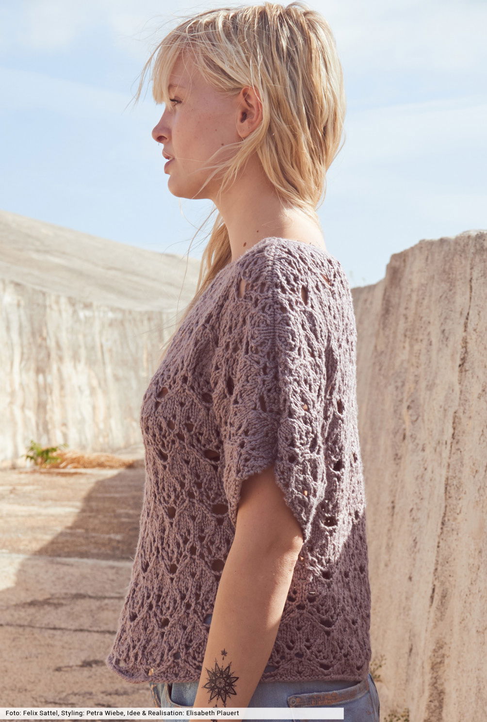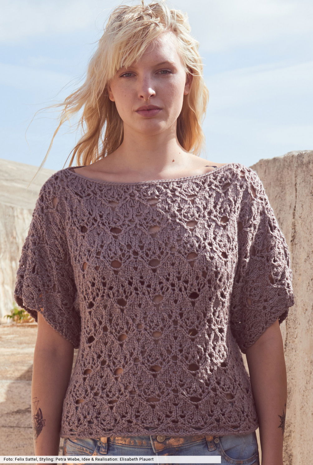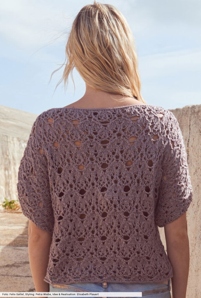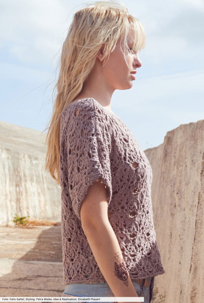Es sind die urig schlammigen Töne, die immer wieder das Farbbild bestimmen. Hier als einfach geschnittener Pulli mit angestrickten Ärmeln und geradem Turtleneck. So kann man sich voll und ganz auf das extravagante Ajourmuster konzentrieren, für das wir in der Anleitung eine übersichtliche Strickschrift erstellt haben. Das Garn aus Baumwolle mit Tencel gibt den Strukturen den markanten Look und kommt ganz ohne tierische Fasern aus.