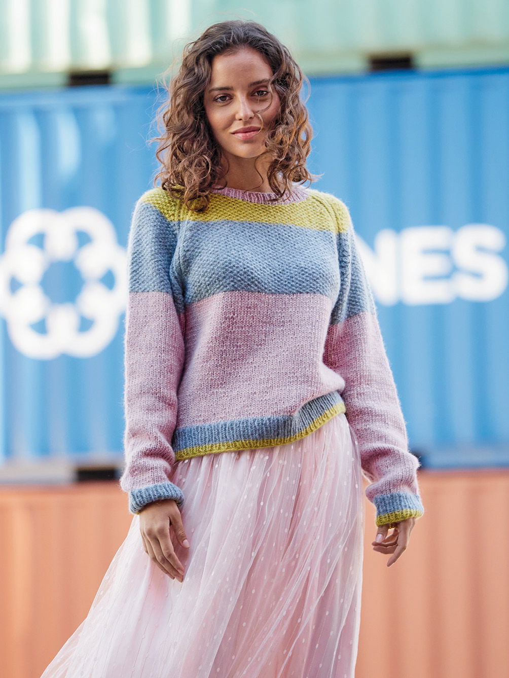 Zeit für leise Töne? Im Prinzip ja. Wenn man sie aber so frech miteinander kombiniert wie bei diesem Colourmix aus altrosafarbenen, graugrünen und gelbgrünen Streifen, entsteht daraus ein Look, mit dem man immer positiv auffällt. Das Garngemisch aus Alpaka, Baumwolle und Schurwolle trägt sich sehr angenehm. Rippenbündchen grüngelb und graugrün gestreift, gefolgt von einem breiten altrosafarbenen Streifen in glatt rechts und die Raglanpasse im Perlmuster in Grüngrau und Gelbgrün – da wird einem, trotz der einfachen Muster, nicht langweilig beim Stricken. Die Halsausschnittblende ist wieder in Rippen in Altrosa gestrickt. Die Anleitung dazu steht für die Größen 38/40, 42/44 und 46/48 zur Verfügung.