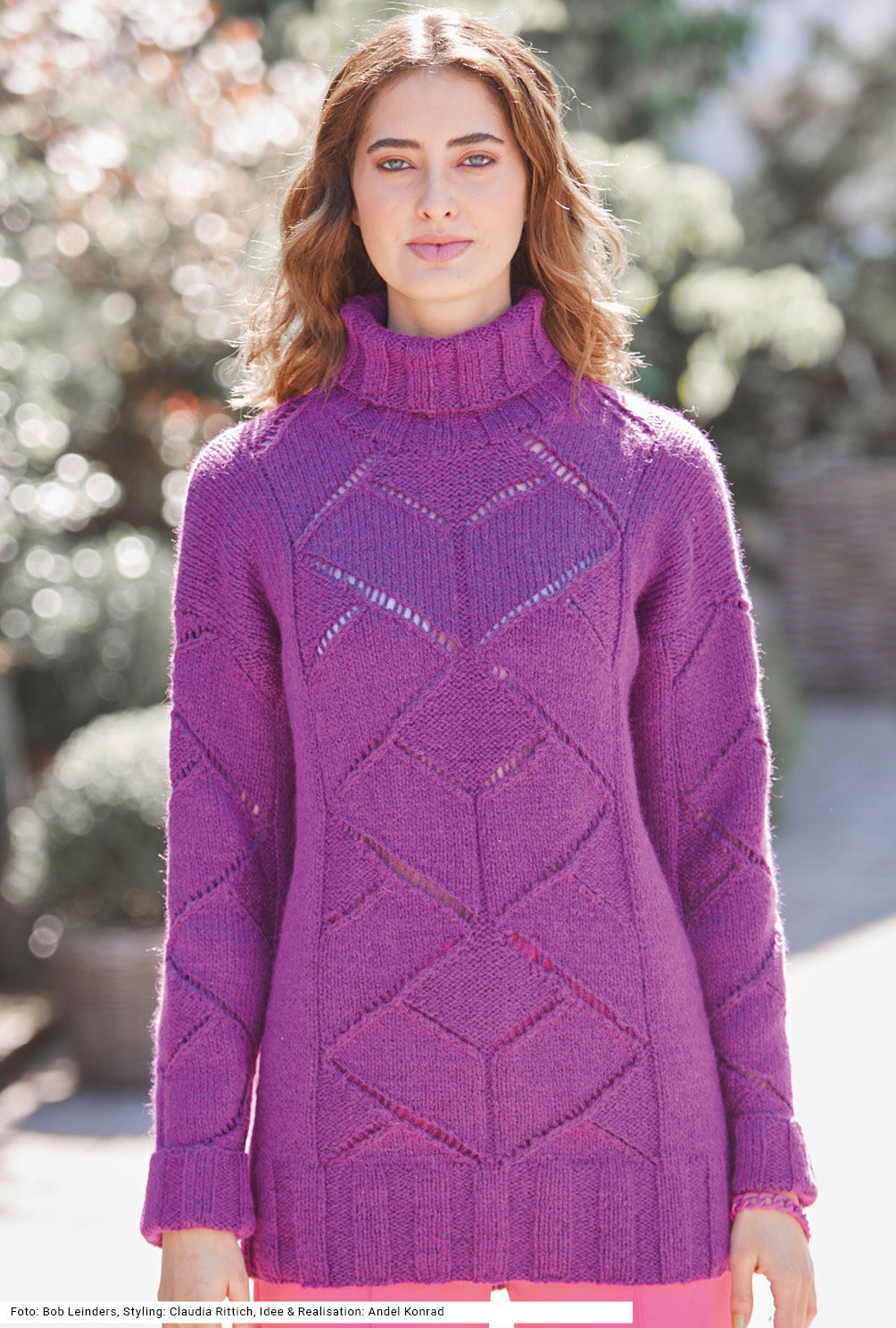 Ein langer, bis über die Hüften reichender Pulli zaubert immer eine schöne Silhouette; zumal der Fokus auf dem Muster in der Modellmitte liegt. Das Ajour-Rautenmuster ist dezent im Look, erfordert aber auch Geduld beim Stricken – es verläuft auch über die Ärmel. Beidseitig davon wird glatt rechts gearbeitet. Der Rollkragen und die Bündchen bekommen ein breites Rippenmuster. Das kräftige Rotviolett des Garns aus Alpaka mit Schurwolle und wenig Polyamid schmeichelt dem Teint. Eine Anleitung ist für die Größen 38/40, 42/44 und 46/48 vorhanden.
