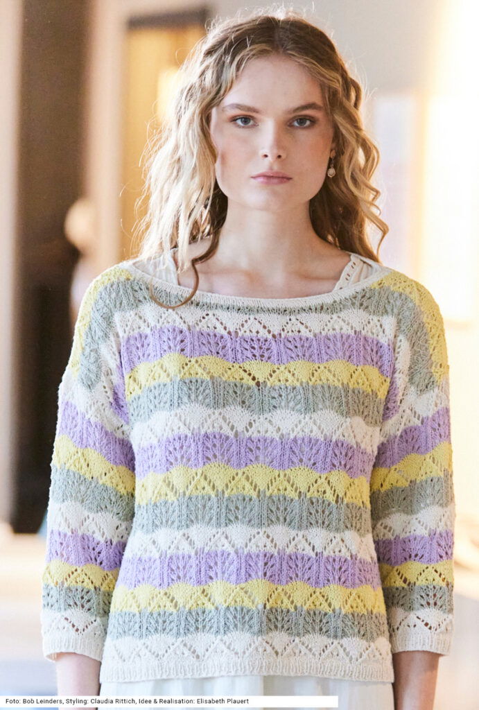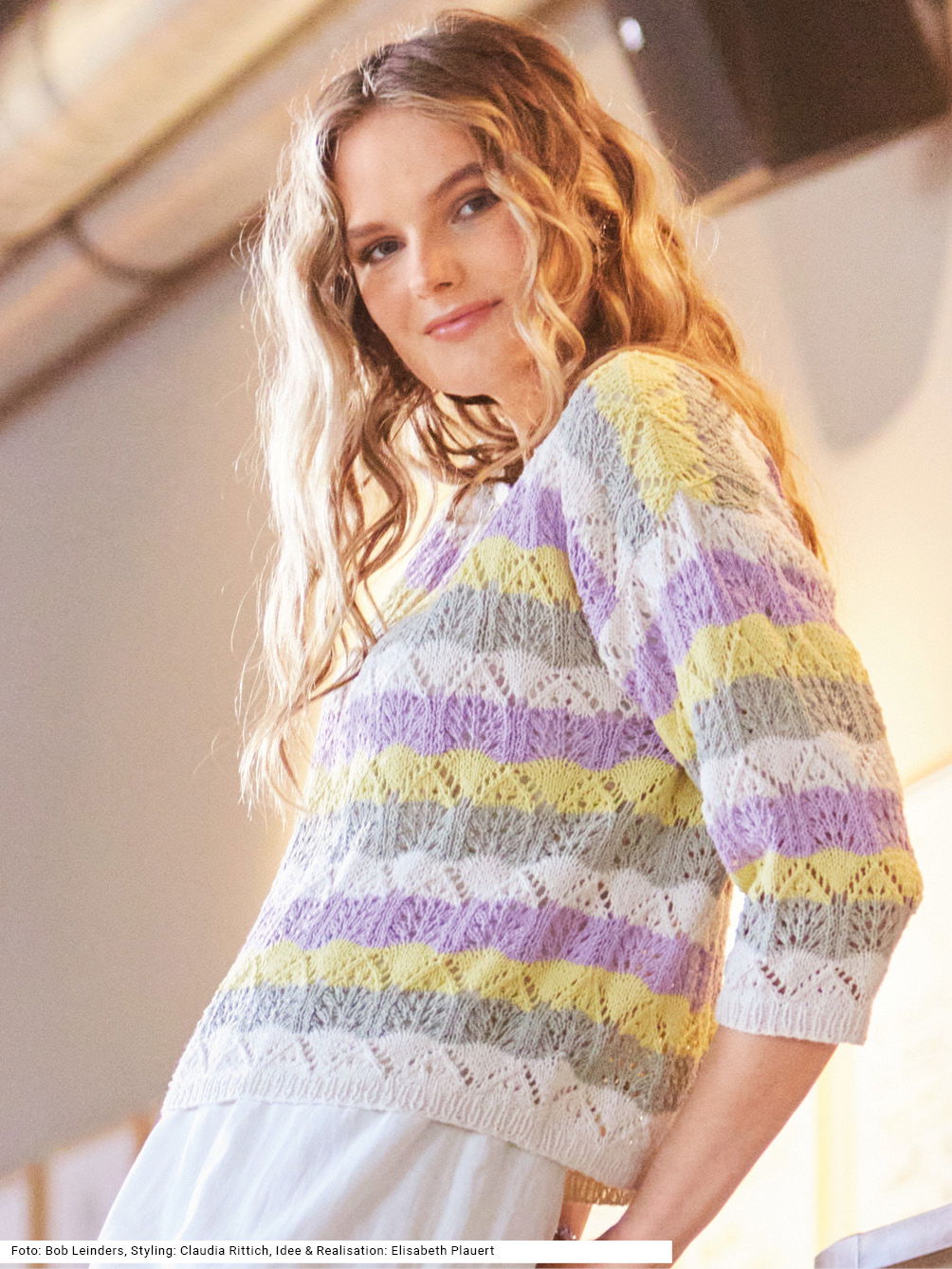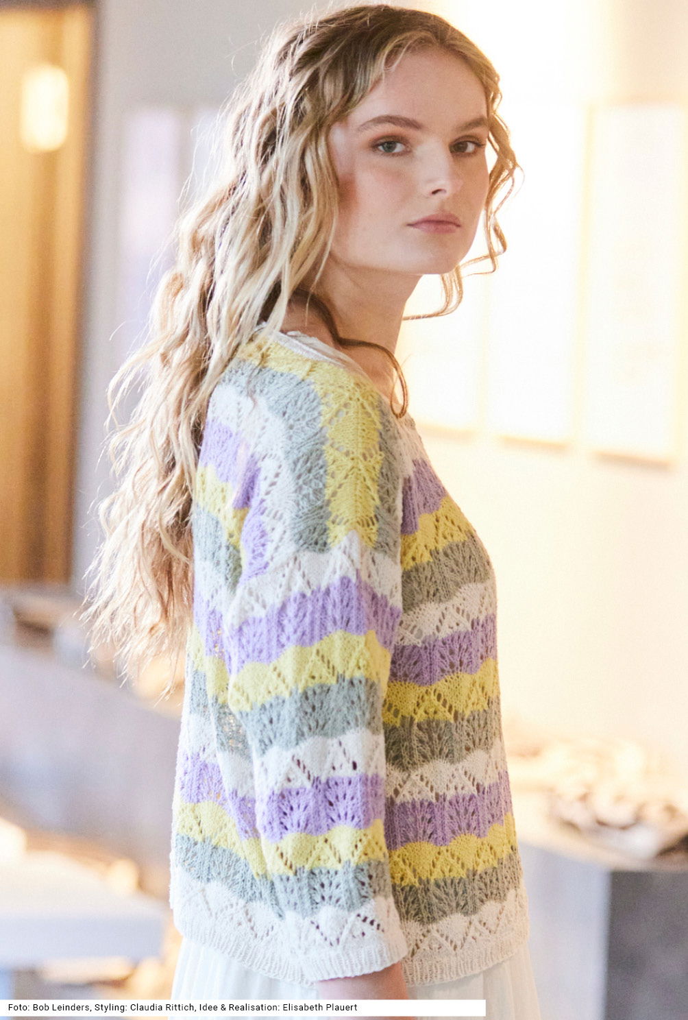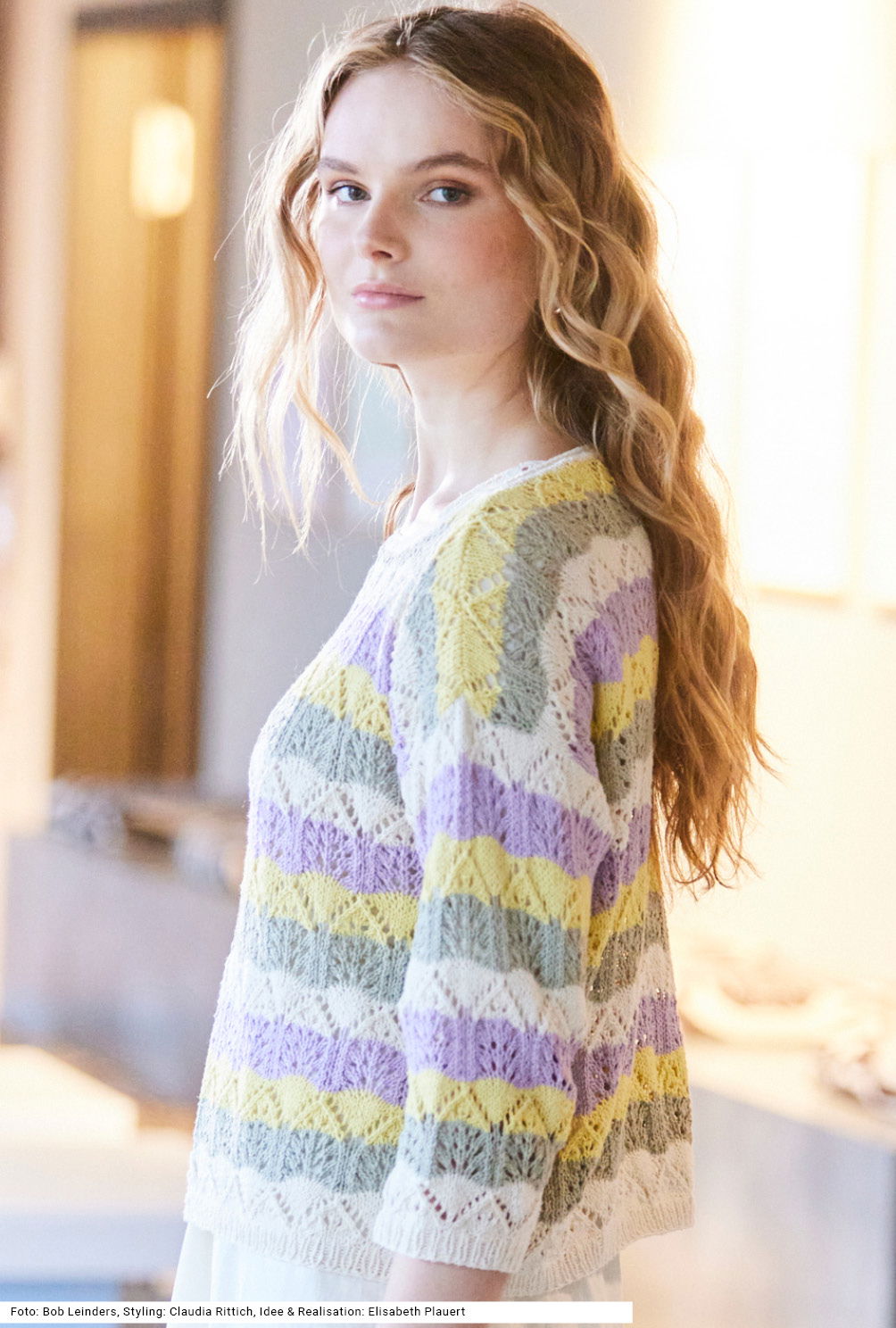 Ein Pulli, dessen Garn aus reiner Seide sich angenehm wohltuend auf der Haut trägt. Dazu ein Ajourmuster, das das Herz einer jeden Strickenthusiastin höher schlagen lässt, denn es bietet erfreuliche Abwechslung beim Stricken. Wir haben pastellige Farben gewählt, jedoch sieht dieses Modell auch in jeder anderen Farbkombination gut aus. Der breite runde Halsausschnitt bekommt noch einen Rollrand aus glatt rechts gestrickten Maschen. Der niedrige Bund an Vorder-, Rückenteil und Ärmeln ist im 1/1-Rippenmuster gearbeitet. Die Anleitung dazu ist für die Größen 36/38, 40/42 und 44/46.