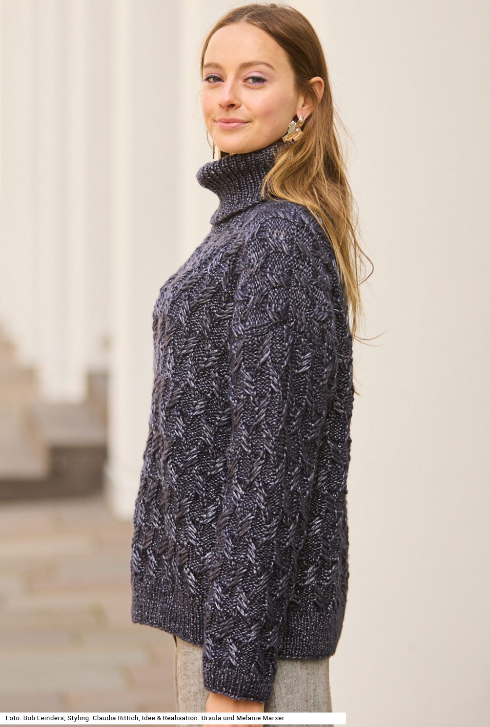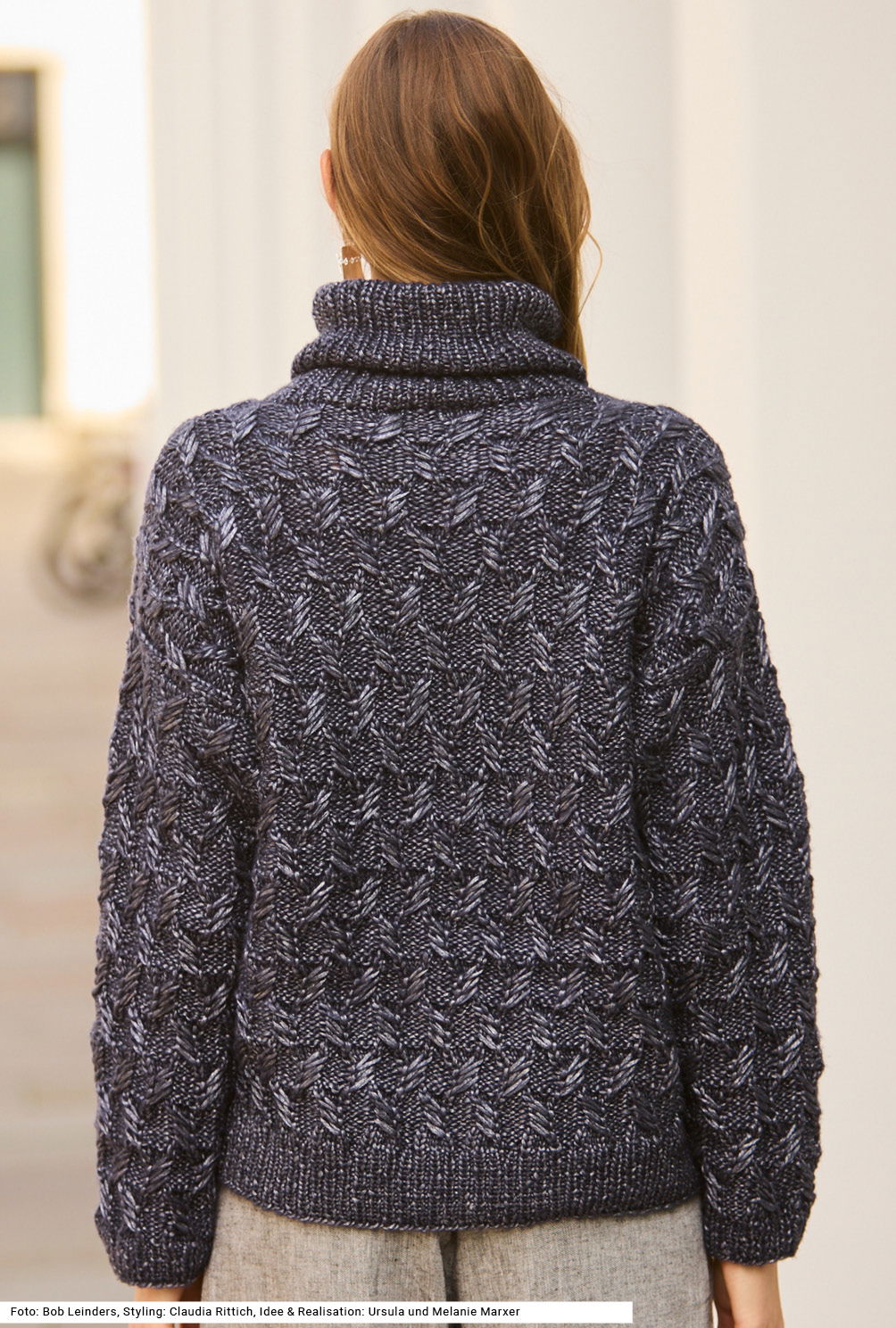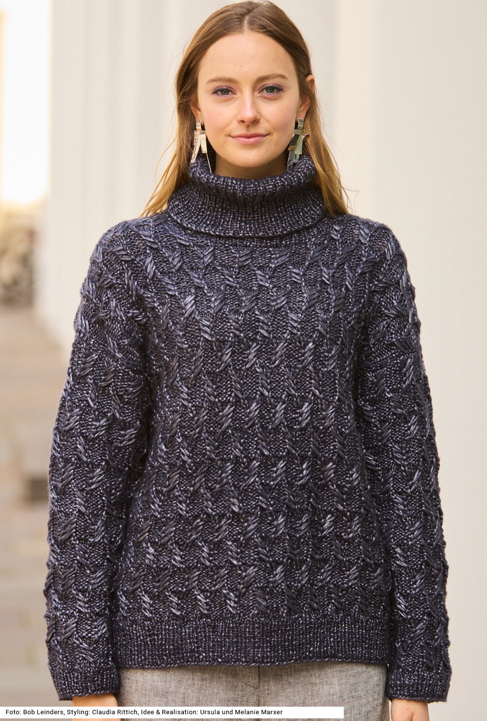 Der warme, lässig geschnittene Rollkragenpullover besticht mit einem Hauch von Eleganz – das kommt vom schimmernden Garn, das mit seiner silbrigen Note punktet. Das Garn besteht aus Schurwolle und Viskose, die ihm den Glanz verleiht. Das versetzte Zopfmuster mit seiner klaren Struktur unterstreicht den hochwertigen Charakter des Modells. Vorder- und Rückenteil sind ganz gerade mit rundem Halsausschnitt im Vorderteil geschnitten, die Ärmel haben eine bequeme Weite. Alle Bündchen und der Rollkragen werden im 1/1-Rippenmuster gestrickt. Die Anleitung dazu gibt es für die Größen 36/38, 40/42 und 44/46.