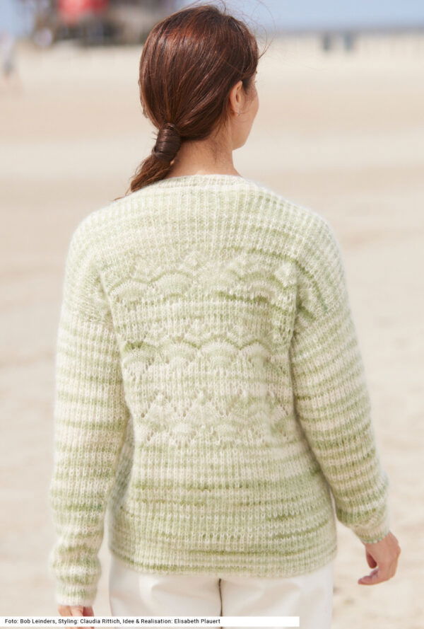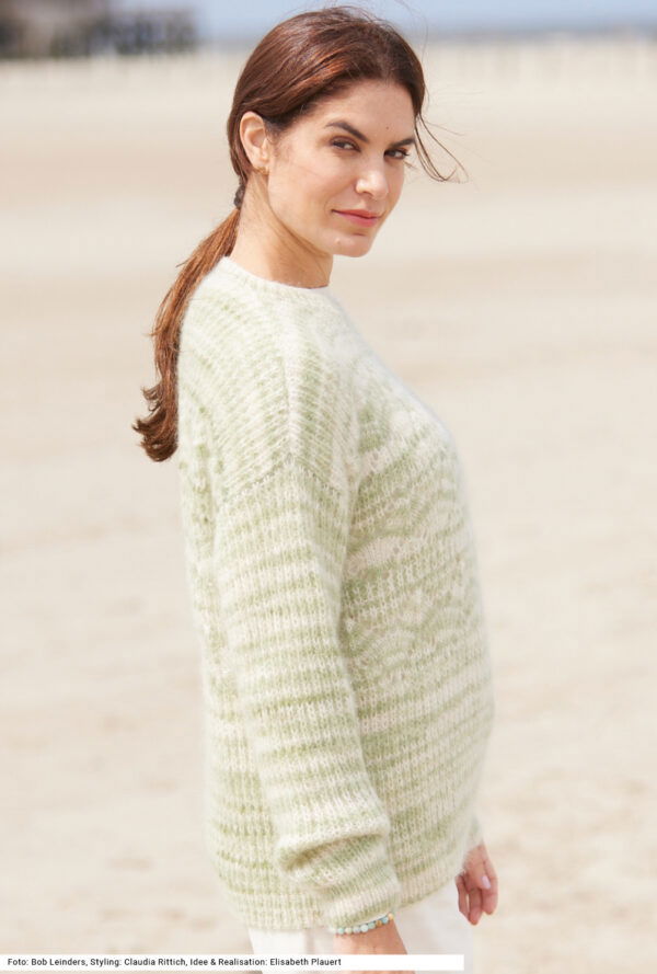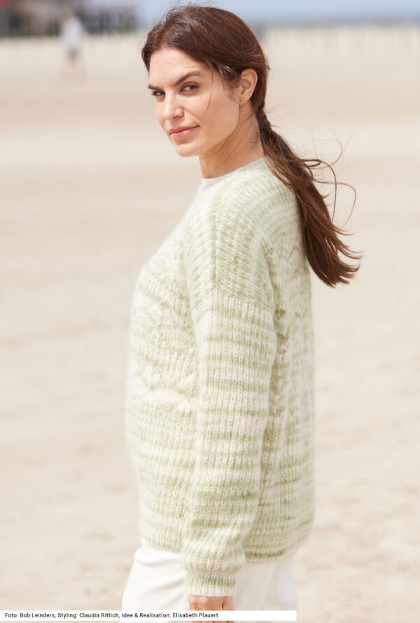 Pullover im Halbpatent und Ajourmuster in pastellem grün-beigen Farbverlauf