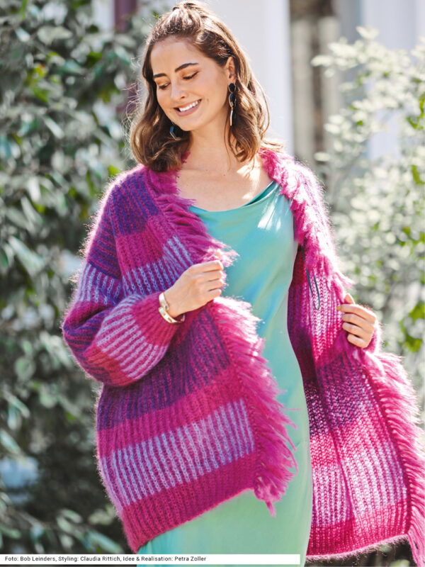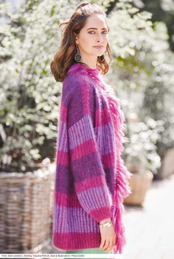 Lange Jacke im Jacquardmuster in Natur, Pink und Aubergine mit Gürtel