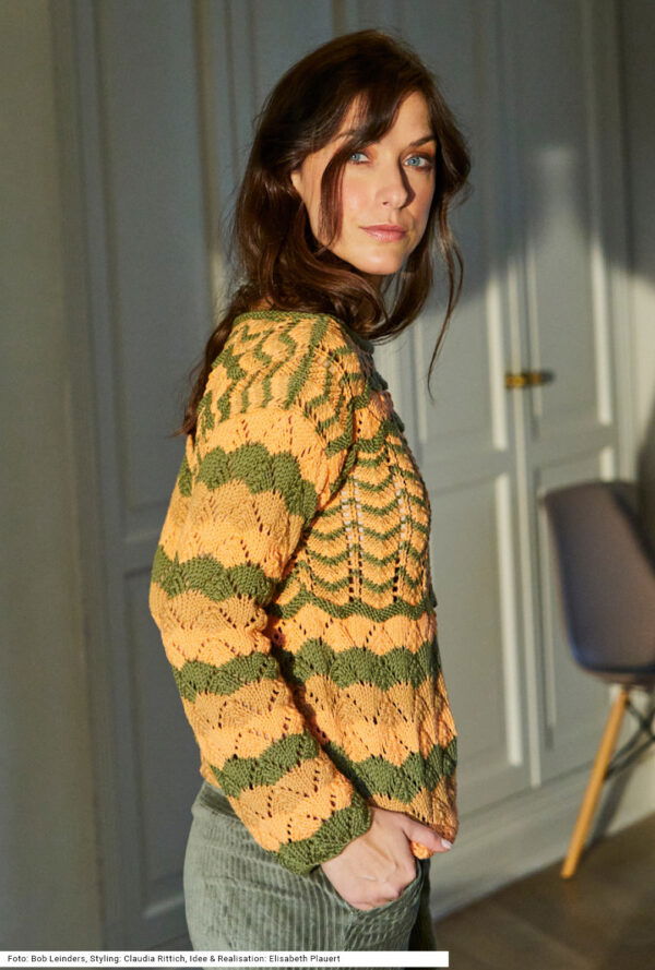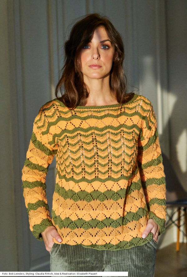 Streifenpulli mit Ajourmuster in Grün, Orange und Camel