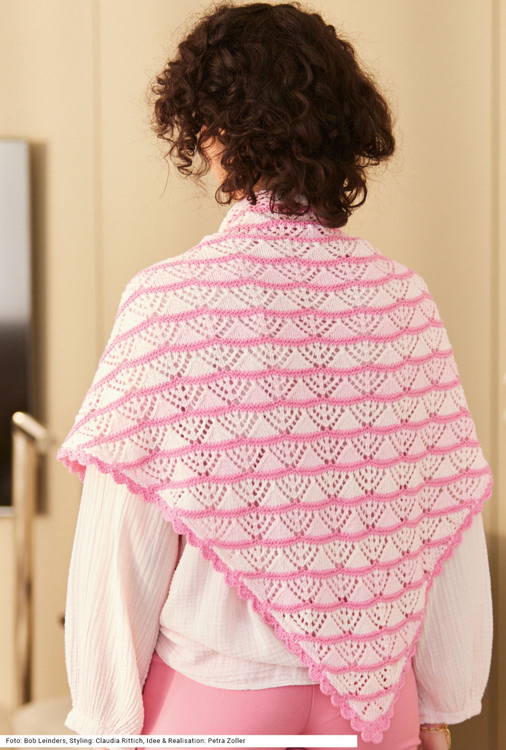 Dieses Dreieckstuch aus reiner weicher Baumwolle ist perfekt für Frauen, die einen sanften, femininen Look mögen. Kraus-rechts-Rippen in kräftigem Pink trennen die Ajourstreifen in zartem Rosé und Blassrosa voneinander. Die Umrandung an den schrägen Seiten besteht aus einer gehäkelten Muschelborte in Pink. Für die Spitze, also den Beginn, gibt es eine ausführliche Strickschrift, in der auch der fortzuführende Rapport für das Ajourmuster enthalten ist. Die Anleitung dazu kann für ein Tuch in der Größe 155 x 83 cm downgeloadet werden.