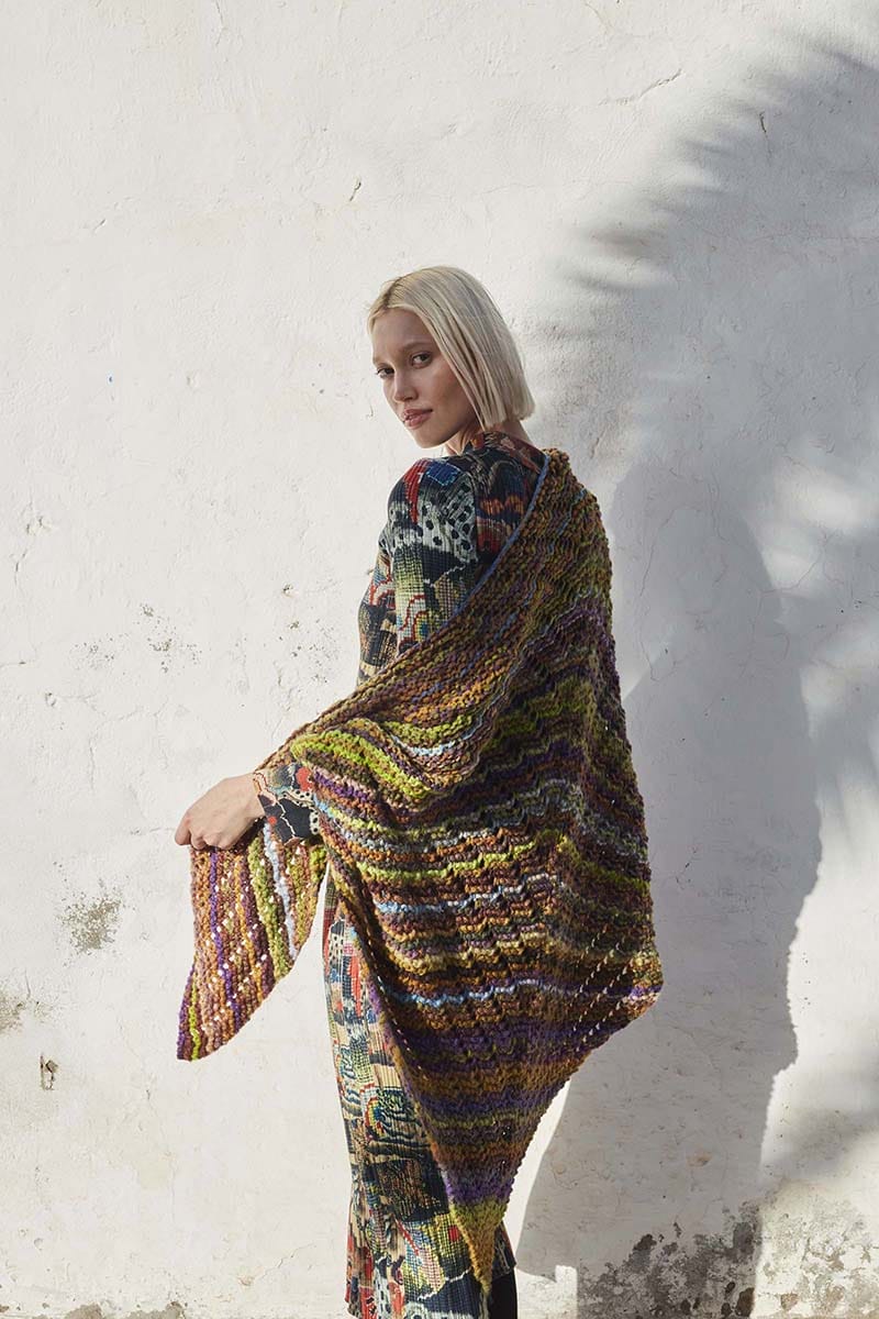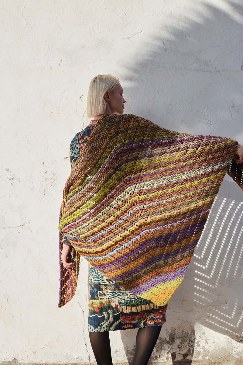 Cuddle up under the open sky – The INFINITE SKY triangular shawl envelops you in its generous size, offering a luxurious and comfortable drape. While the fine stripes and self-patterning of the yarn create a captivating visual tapestry, resembling the ever-expansive beauty of the sky.