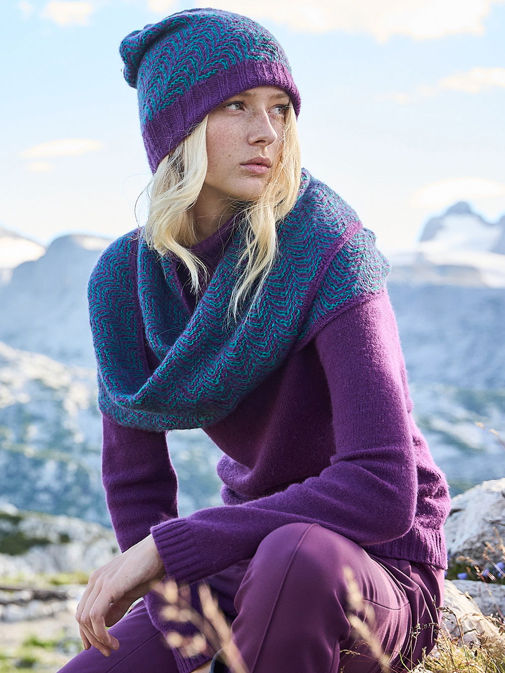 Material: Für die Mütze: je 25 g Petrol (Fb 0074) und Zyklam (Fb 0047), für den Loop: je 75 g Petrol (Fb 0074) und Zyklam (Fb 0047) "Cashmere Dreams" (65% Kaschmir, 35% Seide, LL = 290 m/25 g) von LANGYARNS. Für die Mütze je 1 Nadelspiel Nr 3 und 4; für den Loop 1 Rundstricknadel Nr 4.