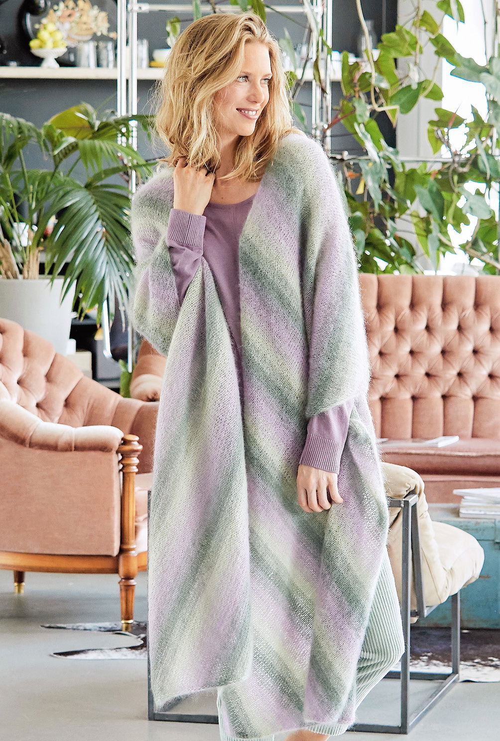 Pudrige Farbharmonien wirken entspannend und laden zum Träumen ein. Hier ist es ein diagonal gestrickter Schal, der durch eine Kordel auf Taille gebracht werden kann oder einfach ganz lässig um die Schultern gelegt wird. Der sanfte Farbverlauf entsteht dadurch, dass das feine Mohair- Seidengarn zweifädig verstrickt wird, wobei immer wieder ein Faden farblich ausgetauscht wird. Die diagonale Strickrichtung bringt die Farbwechsel dann noch einmal ganz besonders geschickt zur Wirkung. Immer glatt rechts mit Patenträndern gestrickt geht es mit Nadelstäke 4,5 ganz relaxed überraschend zügig voran. Tipp: Diese Technik eignet sich auch hervorragend zur Resteverwertung. Einfach einen eigenen Farbverlauf probieren – dieser kann aus unendlich vielen Farben bestehen