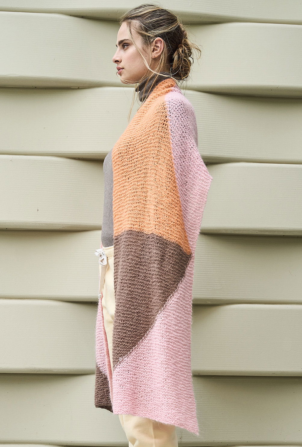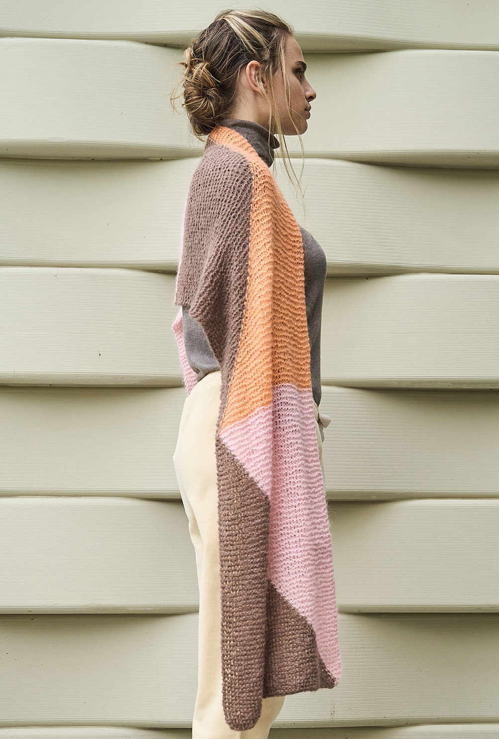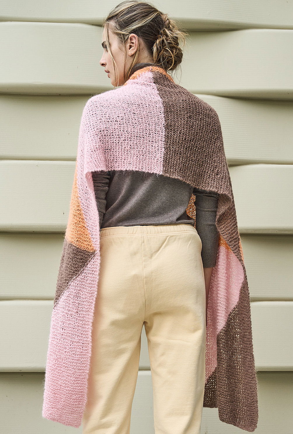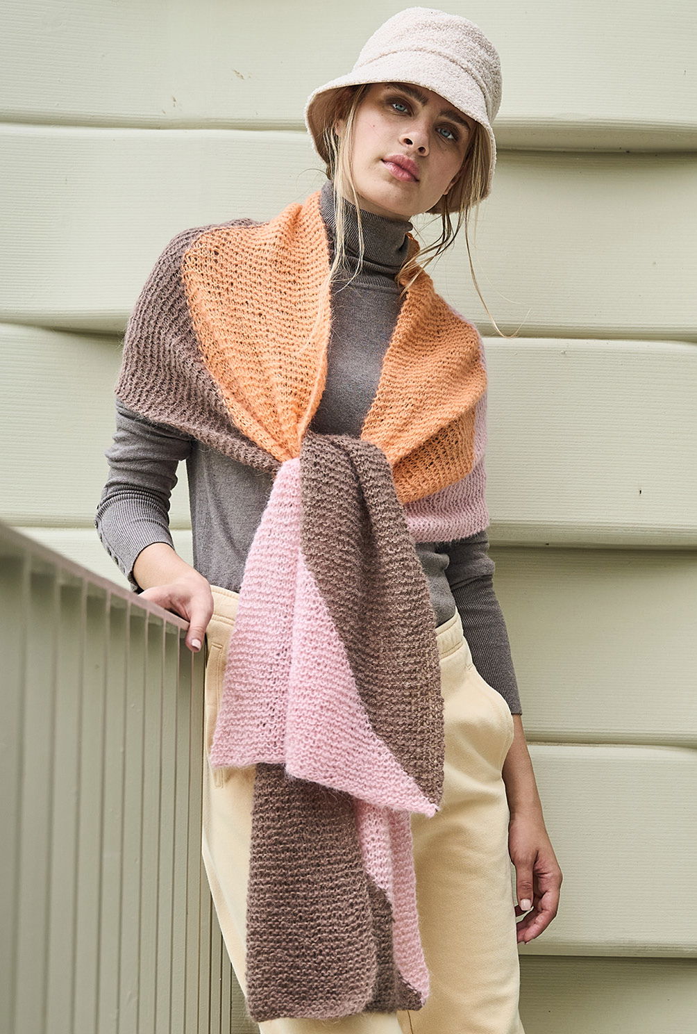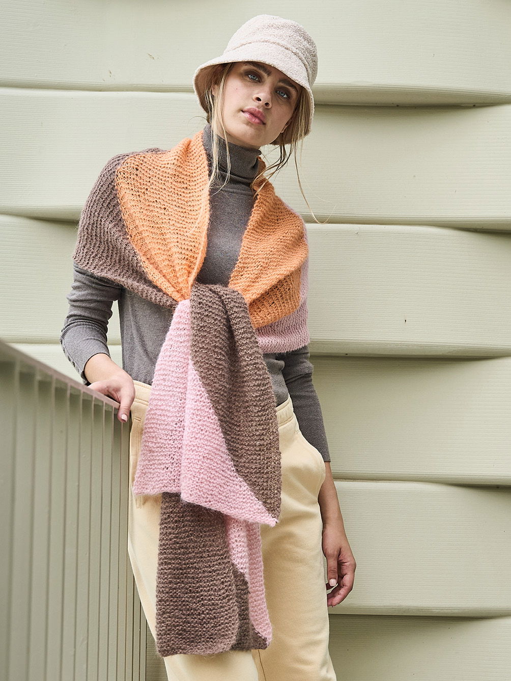 Material: Je 75 g Nougat (Fb 4) und Rosa (Fb 8) und 50 g Lachs (Fb 22) "Setasuri" (69% Alpaka, 31% Seide, LL = 212 m/25 g) von LANA GROSSA. 1 Paar Stricknadel Nr 6.