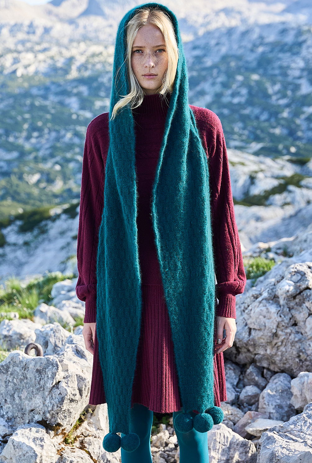 Durch das einfache Kästchenmuster aus rechten und linken Maschen können sich auch Strickneulinge an diesen tollen Kapuzenschal wagen. Die Zunahmen für die unteren Schrägungen und die Passform der Kapuze werden in der Anleitung genau beschrieben. Die Pompons an den Rändern werden mit einem Pompon-Maker erstellt, der in jedem guten Bastelladen oder Wollfachgeschäft erhältlich ist. So kannst Du Dir in wenigen Stunden aus noblem Kaschmirgarn ein echtes Winter-Statement nadeln, das Dir wohlig-weich Kopf, Hals und Schultern wärmt.