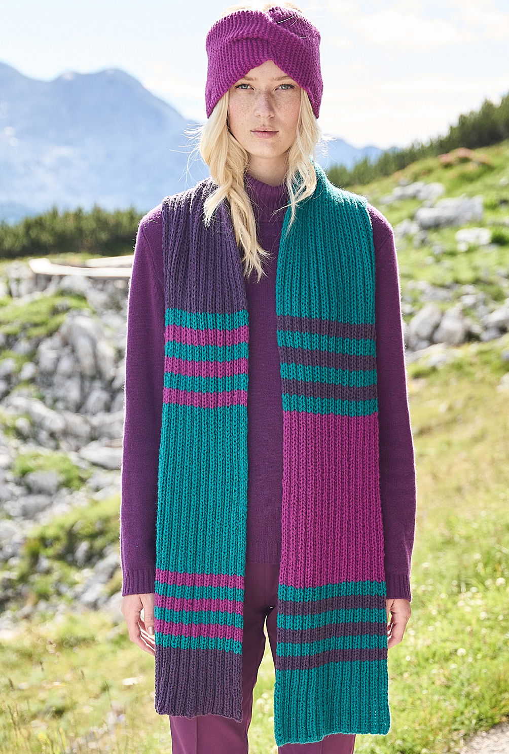 Material: Für den Schal: 175 g Petrolgrün (Fb 0073), je 75 g Zyklam (Fb 0065) und Lila (Fb 0090), für das Stirnband: 50 (75) g Zyklam (Fb 0065) "Cashmere Premium" (100% Kaschmir, LL = 115 m/25 g) von LANGYARNS. Für den Schal 1 Paar Stricknadel Nr 7, für das Stirnband 1 Paar Stricknadel Nr 5,5.