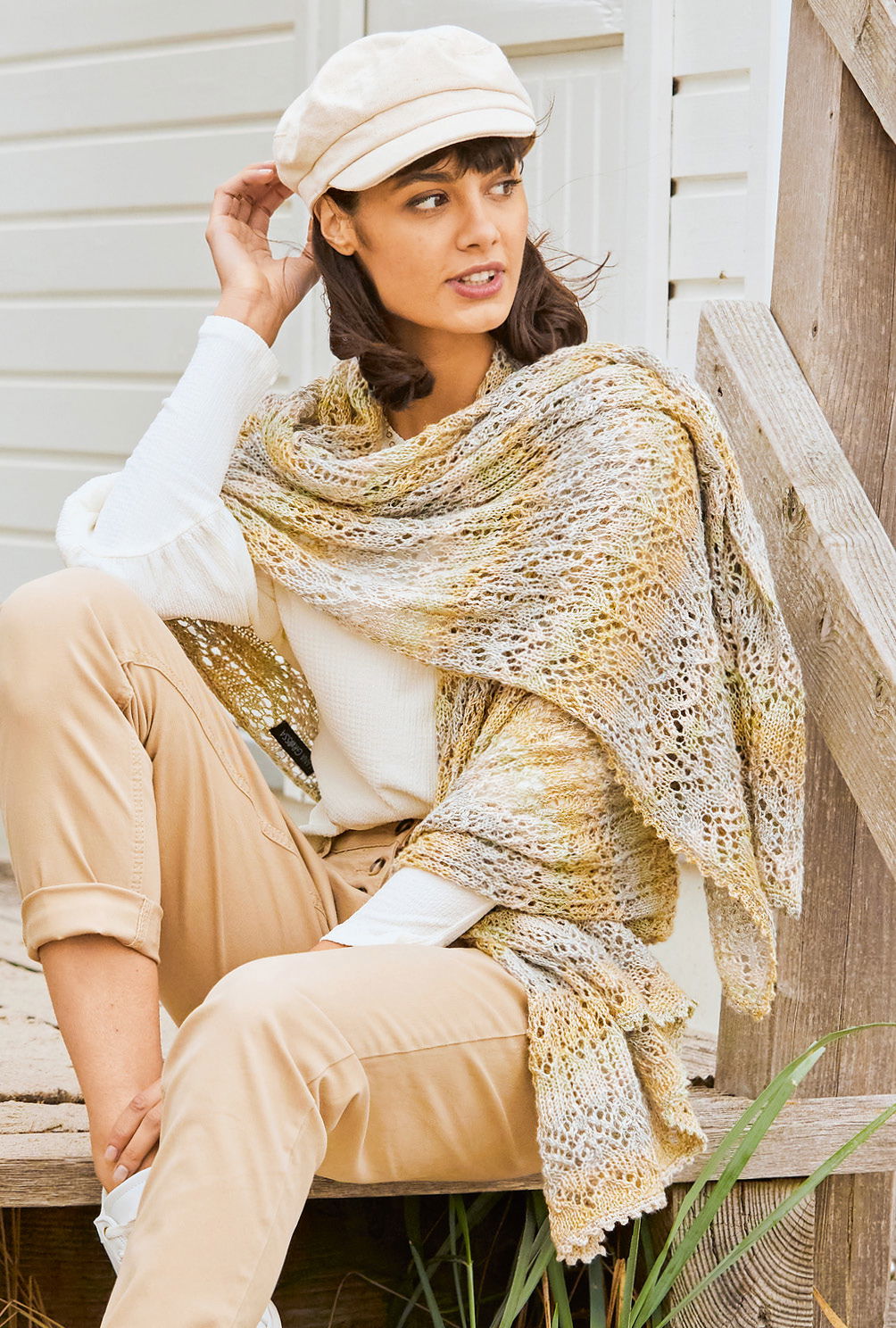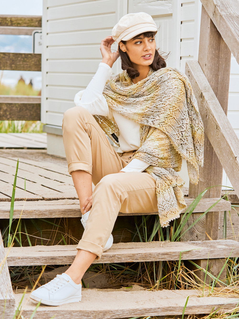 Farbverlaufsgarne haben sich inzwischen in der Handarbeits-Szene fest etabliert. Kein Wunder, denn es ist immer wieder spannend, wie sich während des Strickens die unterschiedlichen Nuancen entwickeln. Besonders schön kommen solche Garne auf so zarten, breiten Tüchern und Stolen zur Geltung, wie bei diesem Design der Fall ist. Die sanft geschwungenen Bögen des Ajourmusters unterstreichen den sanften Farbverlauf und muten wie feine Sandwellen an. Wie alle Lochmuster, erfordert auch dieses etwas Aufmerksamkeit, ist aber nicht ausgesprochen komplex und durch die übersichtliche Strickschrift unkompliziert nachzuarbeiten. Nach der Fertigstellung wird das feine Gespinst vorsichtig gespannt, damit sich die wahre Pracht des Lacemusters entfalten kann. Dann noch mit einer Runde feinen Picots umhäkeln.