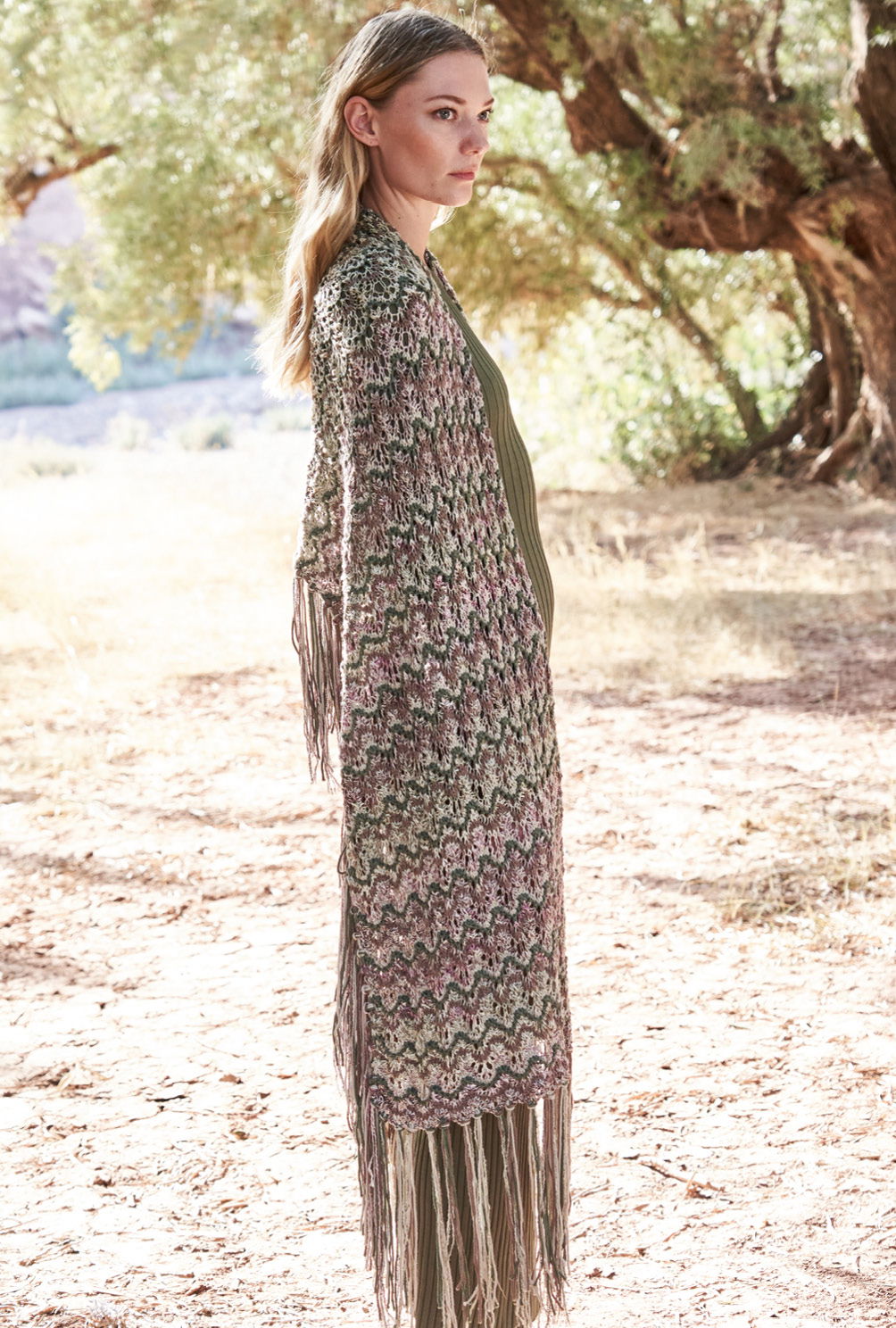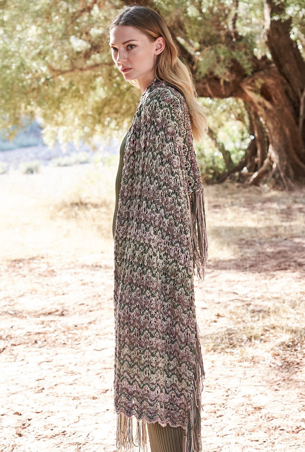 Mit ihren knapp zwei Metern Länge macht diese wunderschöne Stola so manchem Mantel Konkurrenz. Aus zwei verschiedenen Garnen gestrickt, mit Zacken gemustert und mit Fransen dekoriert ist sie ein wahres Schmuckstück – nicht nur für eine Saison. Mit Nadelstärke 5 geht es im unkomplizierten Lochmuster zügig voran. Die übersichtliche Strickschrift zeigt stets, was für eine Masche als nächstes an der Reihe ist. Besonders viel Spaß bereitet dabei die harmonische Streifenfolge – die nicht benötigten Farben werden dabei einfach am Rand mitgeführt, das erspart das zeitintensive Vernähen. Diese mitgeführten Fäden werden später ganz einfach während des Einknüpfens der dekorativen Fransen mit eingeknüpft. Tipp: Wer die Stola lieber ohne Fransen haben möchte, strickt an den Rändern am besten einen I-Cord Rand. Auch in diesem lassen sich die mitgeführten Fäden bestens verstecken.