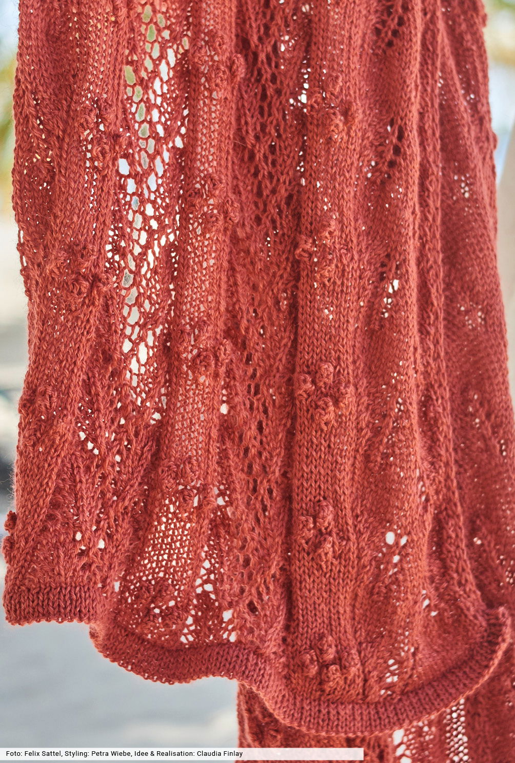 Material: LANAMANIA "Silky" (70% Alpaka, 30% Seide, LL = 200 m/50 g) 250 g Coral (Fb S22). 1 Paar Stricknadel Nr 4.