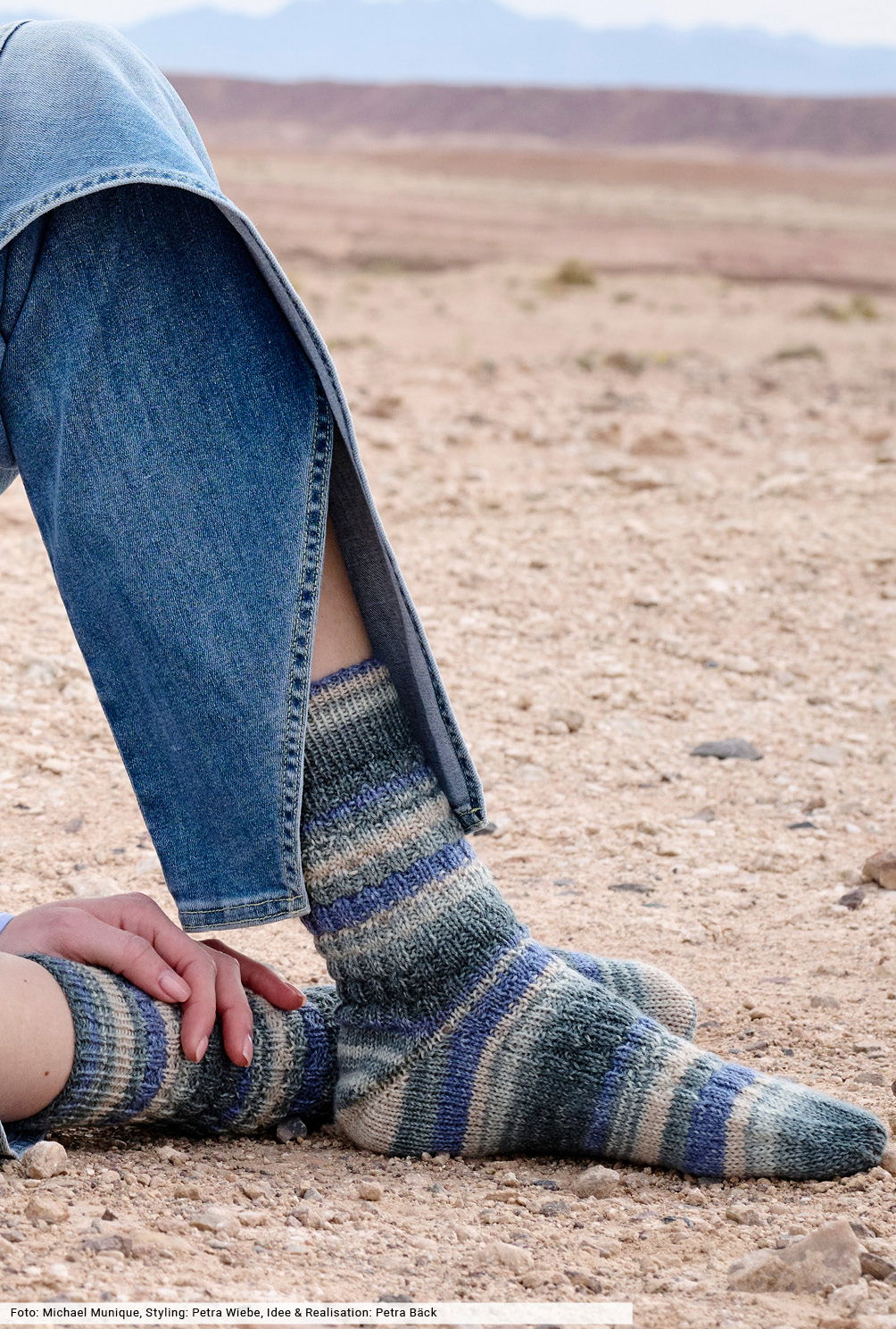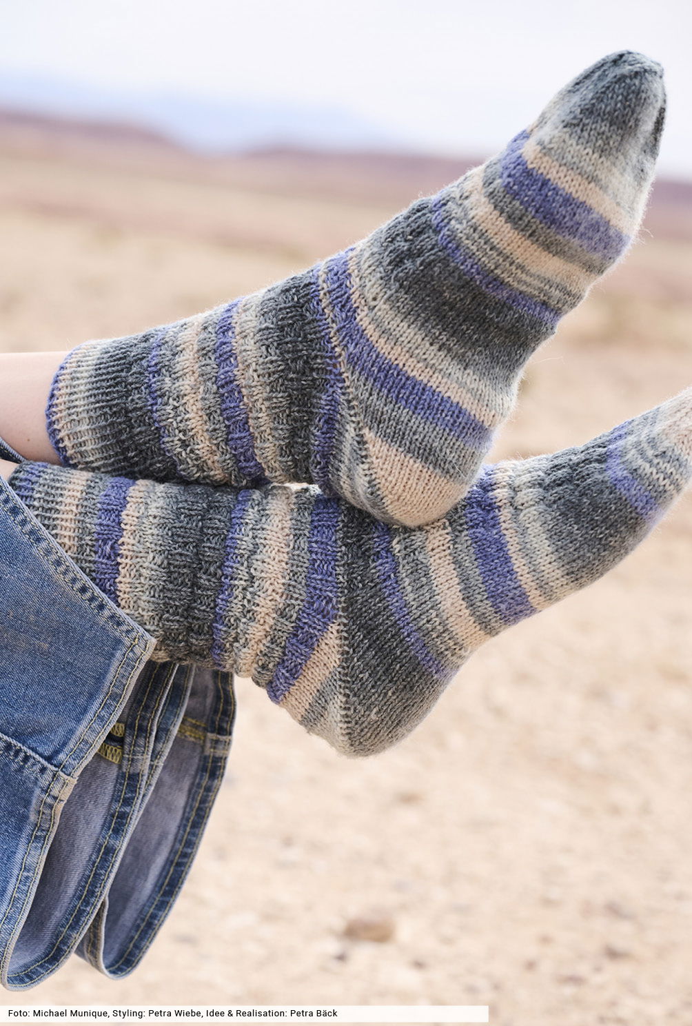 Wärmekomfort bis in die Zehenspitzen: Dank robustem Garn aus Schurwolle und Polyamid werden diese Socken alltagstauglich und immer tragbar. Das einfache Wabenmuster besteht aus rechten und linken Maschen und lässt auch Strickneulinge zum Erfolg kommen. Weiteres Plus: Der Farbverlauf von Natur über Salbei bis hin zu Jeansblau bringt Spannung in die Arbeit, da immer nach wenigen Runden der Farbwechsel stattfindet.
