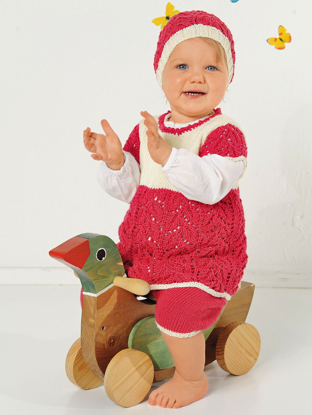 Schick in Schale wird dein Baby sein in diesem luftigen Kleidchen mit passender Hose. Und wer mag, strickt auch noch die passende Mütze dazu. Der Rockteil des Kleids und auch die Ärmel sind im flamingofarbenen Blatt-Ajourmuster, die Passe in Natur glatt rechts gestrickt. Die Bündchen sind dagegen kraus rechts in Natur und für die Ausschnittblende werden flamingofarbene feste Maschen und Picots angehäkelt. Auch die Hose hat diese Farbkombi: naturfarbene Rippenbündchen an den Beinen und um die Taille, dazwischen die glatt rechts gestrickte Pumphose in Flamingo. Die Mütze wiederum besteht aus dem flamingofarbenen Blatt-Ajourmuster, das für besseren Halt auf dem Kopf mit einem naturfarbenen Rippenbündchen beginnt. Die Anleitung ist für die Baby-Größen 56 – 62, 68 – 74 und 80 – 86.
