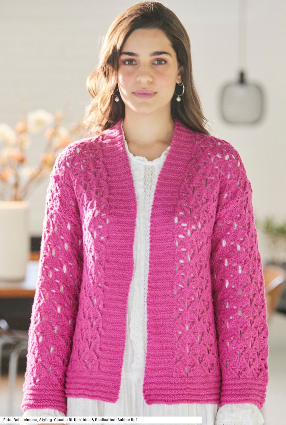 Die verschlusslose Jacke mit Ajourmuster besticht durch ihre Leuchtkraft, begeistert aber auch dank des weichen, flauschigen Garns mit Brennnessel-Anteil (Mischung aus Baumwolle und Ramie). Das Muster des Modells wird in Hin- und Rückreihen gebildet, dadurch muss man sehr konzentriert arbeiten! Die gleich mitgestrickte vordere Blende läuft als Schalkragen um den rückwärtigen Halsausschnitt weiter. Bund und Blende haben dasselbe Querrippenmuster. Vorderteile und Rückenteil sowie auch die Ärmel sind ganz gerade geschnitten. Eine Anleitung kann für die Größen 36/38, 42/44 und 48/50 downgeloadet werden.
