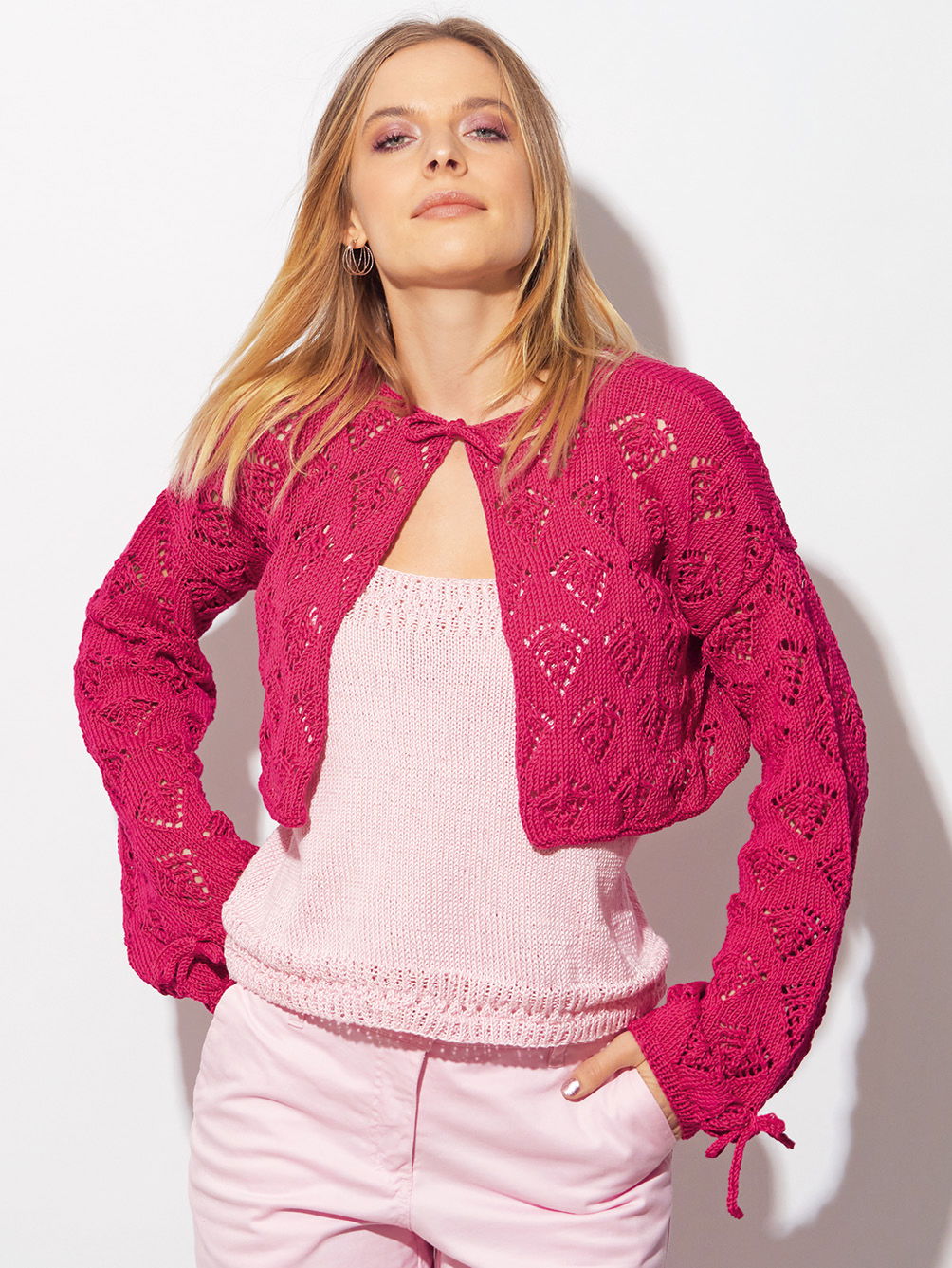 Dieses tolle Set macht richtig was her. Die Jacke mit den legeren Ärmeln und den überschnittenen Schultern wird an den Ärmeln und im Brustbereich mit kleinen Schleifen geschlossen. Das Top greift dabei das Lochmuster der Jacke im Blendenbereich wieder auf. Dabei wird die Jacke ein einzelnen Teilen gestrickt und zum Schluss zusammengefügt, während das Top in Runden von unten nach oben gearbeitet wird. Hier ist also für jeden etwas dabei. Das grafische und dennoch feminine Lochmuster ist durch die genaue Strickschrift in der Anleitung ganz einfach nachzustricken. Die Schnitte ergänzen die ausführliche Beschreibung perfekt. Das Set kann in den Größen 36/38, 42/44 und 48 gestrickt werden.
