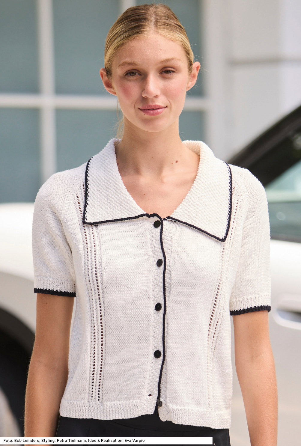 Der cleane Look dieser kurzen Raglanjacke mit üppigem Kragen lässt sich prima im Büro oder bei einer kleinen Feier tragen. Hier werden klassische Schlichtheit und moderne Akzente zu einem perfekten Ganzen vereint. Alle Teile sind glatt rechts mit einer vertikalen Ajourmuster-Linie gearbeitet – außer der Kragen, er wird im Perlmuster gestrickt. Auch die Knopfblenden sind im Perlmuster gearbeitet. Kontrastfarbene Rippen-Bündchen, Knöpfe sowie der Kragenabschluss sorgen für einen Hauch Vintage-Flair. Eine Anleitung für ein Garn aus reiner Baumwolle gibt es für die Größen 36/38 und 40/42 sowie 44/46.