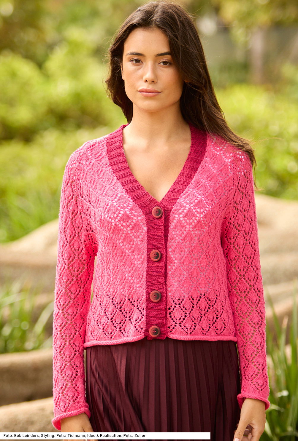 Ein klassischer Schnitt beieiner Jacke mit V-Ausschnitt muss nicht langweilig sein. Das beweist dieses Modell mit Rauten-Lochmuster. Das rührt daher, dass die Vorderteilblende farblich abgesetzt ist und die Ärmel ganz offen enden. Dadurch, dass das Muster zunächst mit glatt rechts beginnt, ergibt sich ein kleiner Rollrand an allen Teilen. Die Knopfblende wird im 2/2-Rippenmuster gearbeitet. Raglanärmel garantieren einen perfekten Sitz an den Schultern. Eine Anleitung für ein Garn aus reiner Baumwolle kann für die Größen 36/38, 42/44 und 48/50 downgeloadet werden.
