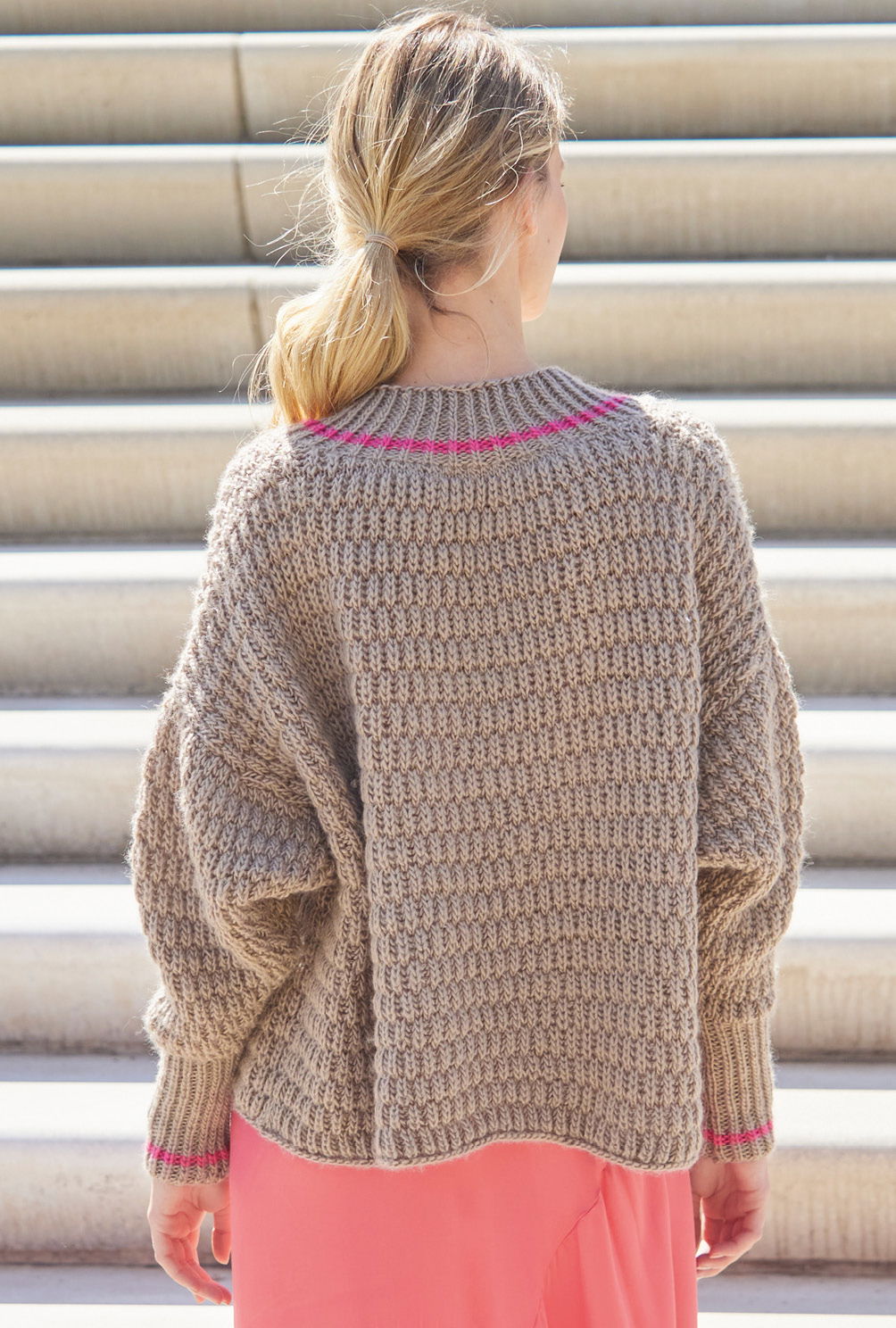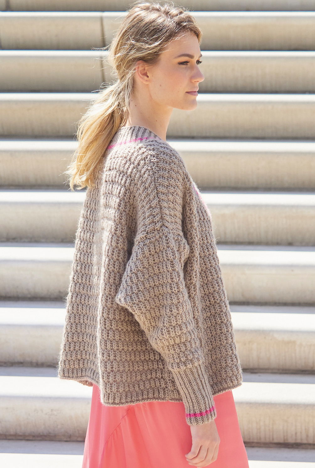 Weit geschnitten, mit überkreuzten Vorderteilen, – so stellen wir uns bequeme Jacken, die zu allem passen, vor. Diese hat ein Muster aus versetzten Patentmusterstreifen und Halbpatent-Bündchen an den Ärmeln sowie an der breiten Ausschnittblende. Bündchen und Blende bekommen noch einen kontrastfarbigen schmalen Streifen in Pink. Geschlossen wird die Jacke aus Schurwolle-Mischgarn mit einem sichtbaren großen Knopf, ein versteckter Magnetknopf hält die weit übereinander liegenden Vorderteile an der richtigen Stelle. Die Anleitung steht für die Größen 36 – 40 und 42 – 46 zur Verfügung.