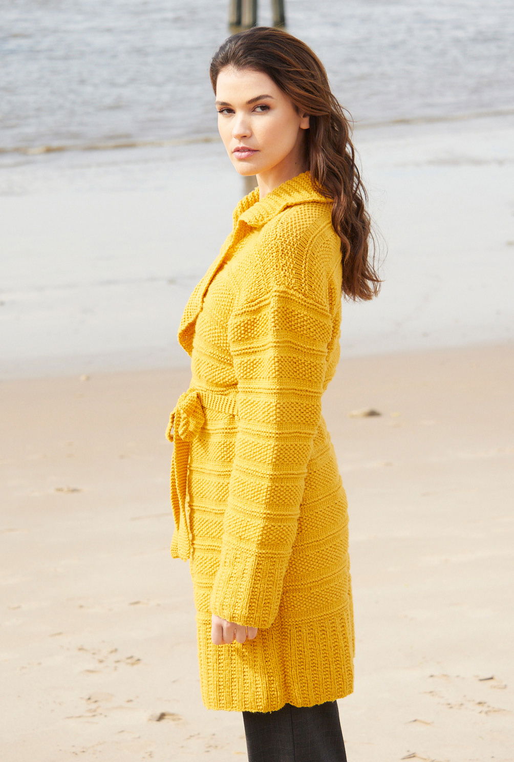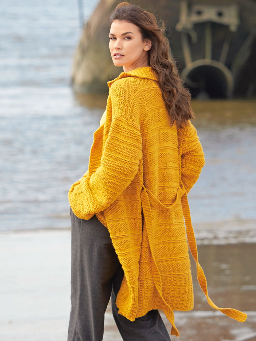 Die lange Jacke aus ockerfarbenem Dochtgarn kann offen getragen oder mit einem kraus rechts gestrickten Bindegürtel geschlossen werden. Vordere Blenden und der Reverskragen sind nicht separat angelegt, sondern werden gleich mitgestrickt. Die hohen Bündchen werden als außergewöhnliche Rippen, 2 Maschen glatt rechts, 2 Maschen kraus rechts gestrickt; die Vorderteilblenden und der Reverskragen sind mit den gleichen Mustern gearbeitet, hier jedoch in horizontaler Richtung. Eine Anleitung gibt es zum Downloaden in den Größen 38 – 42, 44 – 48 und 50 – 54.