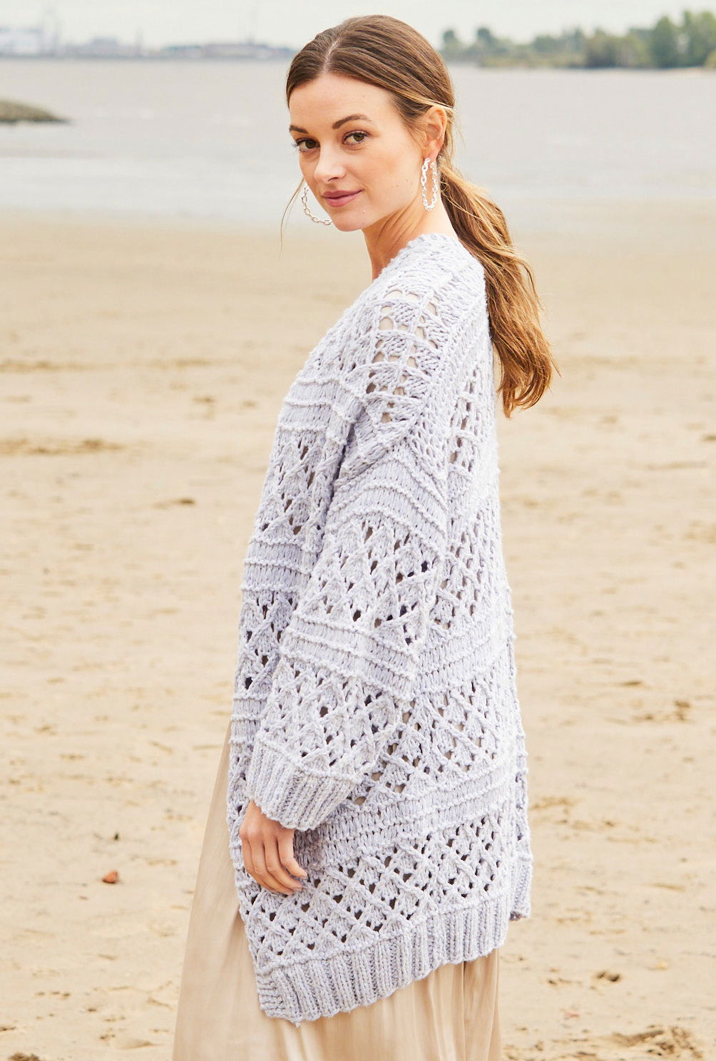 Du liebst Muster und voluminöse Garne? Dann kommt hier dein nächstes Projekt. Diese Jacke besitzt noch dazu einen wirklich uniquen Schnitt. Durch die schräg endenen Vorderteile kommt richtig Dynamik ins Spiel. Das ist auch gar nicht kompliziert. Durch die ausführliche Strickschrift, detailierter Schnitt und Beschreibung erfährst du ganz genau, auf was du achten musst. Die Teile werden vorher einzeln von unten nach oben gestrickt. Die verschlusslose Blende, Musterwechsel im Ajourmuster, Fallmaschen und die Bündchen im Rippenmuster machen das Stricken richtig spannend. Gearbeitet wird in Nadelstärke 6,5 und 7 in den Größen 36 – 40 und 42 – 46.