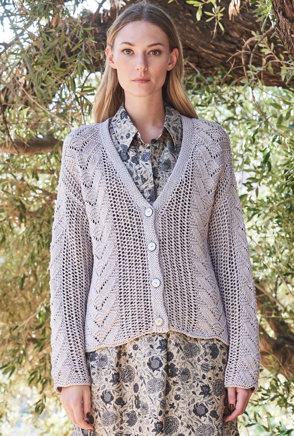 Kühl und luftig – so wünschen wir uns unsere Garderobe für die wärmeren Tage. Da kommt diese Jacke doch genau richtig. Denn so luftig, wie die Maschen ist auch das Garn: Es besteht aus 50% Bio-Baumwolle und 50% Lyocell. Es ist eine schöne Garnkombination, die an sonnigen Tagen angenehm kühl und luftig hält. Lyocell ist übrigens eine Faser zellulosischen Ursprungs, die entsprechend biologisch abbaubar ist. Gestrickt wird die Sommerjacke in Einzelteilen, wovon jedes von unten nach oben gearbeitet wird. Nach einem schmalen Bündchen werden die Maschen für die unterschiedlichen Muster eingeteilt – hierbei können Maschenmarkierer sehr hilfreich sein. Das Pfauenmuster erhält seine ganz besondere Optik in dieser Variation durch eine geschickte Aufteilung von glatt rechts und kraus links gestrickten Maschen. Das ist gar nicht so schwer und die übersichtliche Strickschrift hilft dabei, die Maschen stets im Blick zu haben. Durchbrochen wird das Ajourmuster von Streifen aus Netzmaschen. Mesh ist nicht nur richtig modern, es verleiht dem Design auch seine Leichtigkeit und hält und angenehm kühl. Sind die beiden Vorderteile, das Rückenteil und die Ärmel fertig, werden die Nähte geschlossen und die Blenden im Tunnelpatent gestrickt. Wie bei dieser Technik saubere Knopflöcher gelingen, beschreibt die Anleitung detailliert. Am besten bekommt die Jacke vor den ersten tragen noch ein kleines Bad und wird liegend schön ausgestrichen getrocknet. Dadurch legt sich das schöne Lochmuster richtig und entfaltet seine ganze Schönheit.