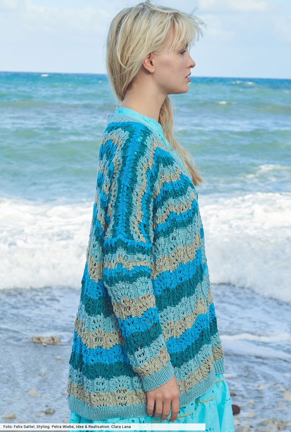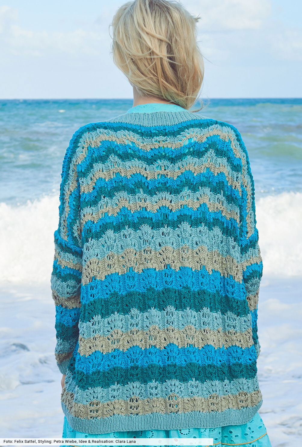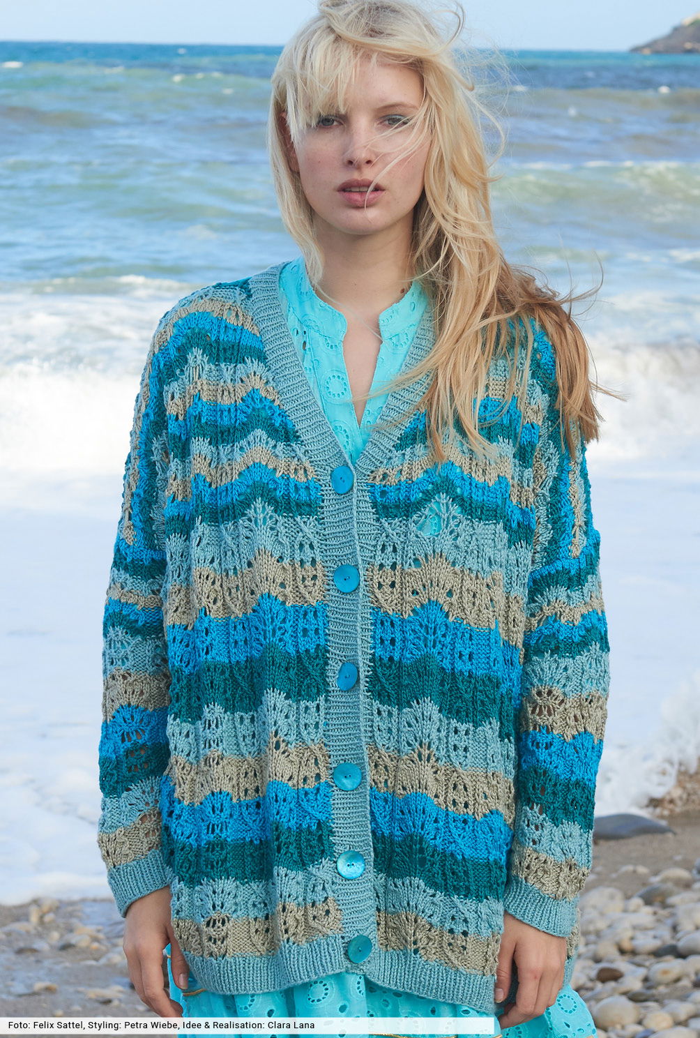Nimm dir jetzt eine Auszeit und verbringe einen Tag am Meer und oder am See. Mit dieser locker geschnittenen Jacke, deren vierfarbiges Wellenspiel in Mint, Beige, Türkis und Petrol für Spannung sorgt. Bei der Anleitung findest du zwei Strickschriften, die dir die Arbeit erleichtern. Aus leicht schimmerndem Baumwoll-Viskose-Garn ein toller Begleiter, dessen farblich passende Knöpfe bestellt werden können.