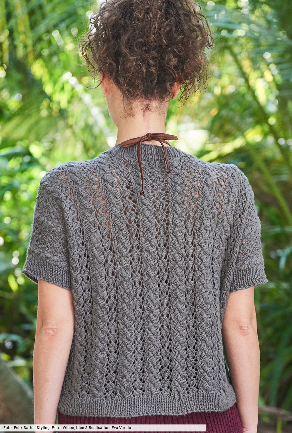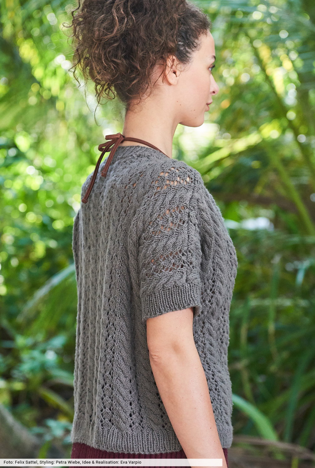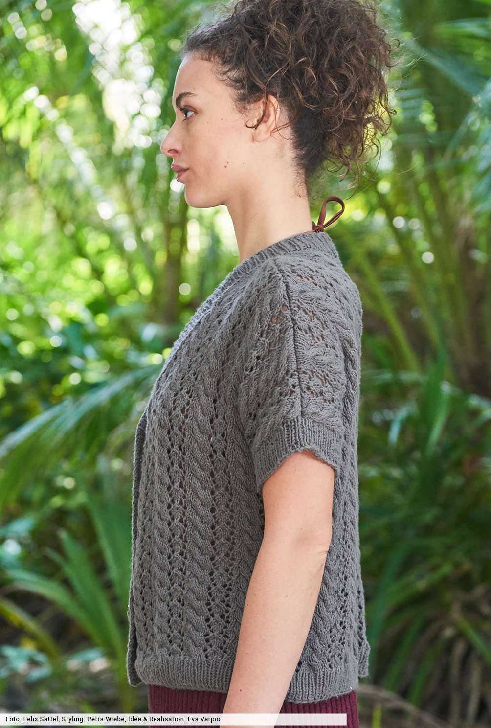 Leicht aufgerautes, sehr weiches Baumwollgarn bildet die Grundlage für das semitransparente Zopf-Lochmuster, für das du eine Strickschrift in der Anleitung findest, die dir die Arbeit erleichten wird. Der moderne Schlamm-Ton ist zu fast allen Sommer-Outfits kombinierbar und steht jeder Frau gut zu Gesicht. Das Finish bilden schmale Rippenblenden und sanft schimmernde Knöpfe, die du ganz einfach online direkt bestellen kannst.
