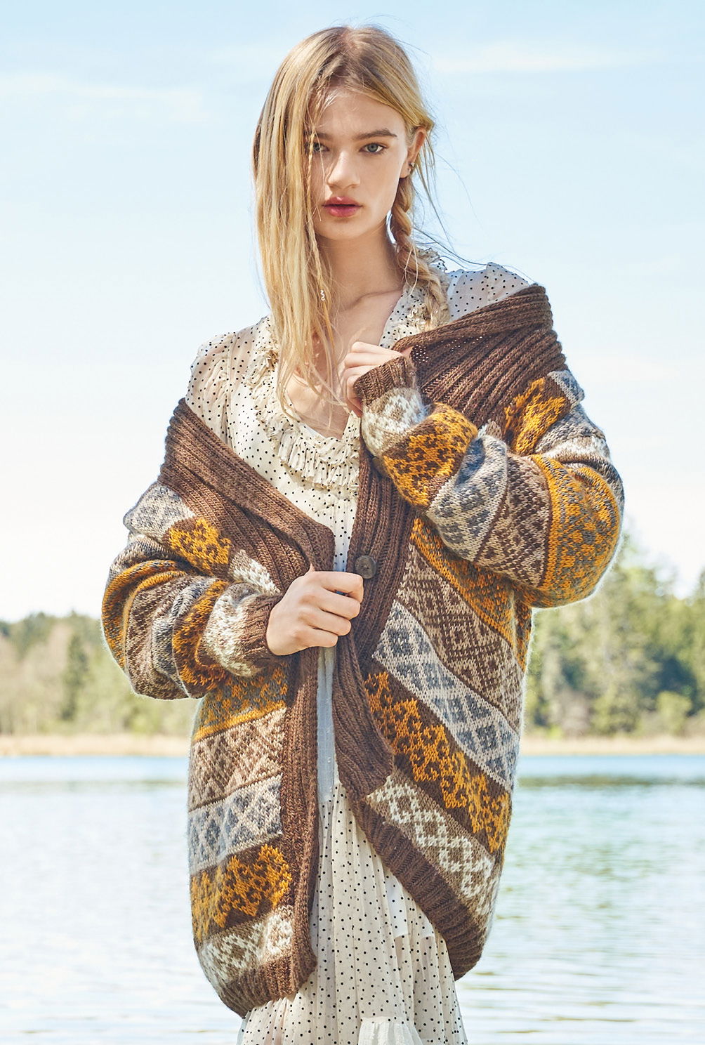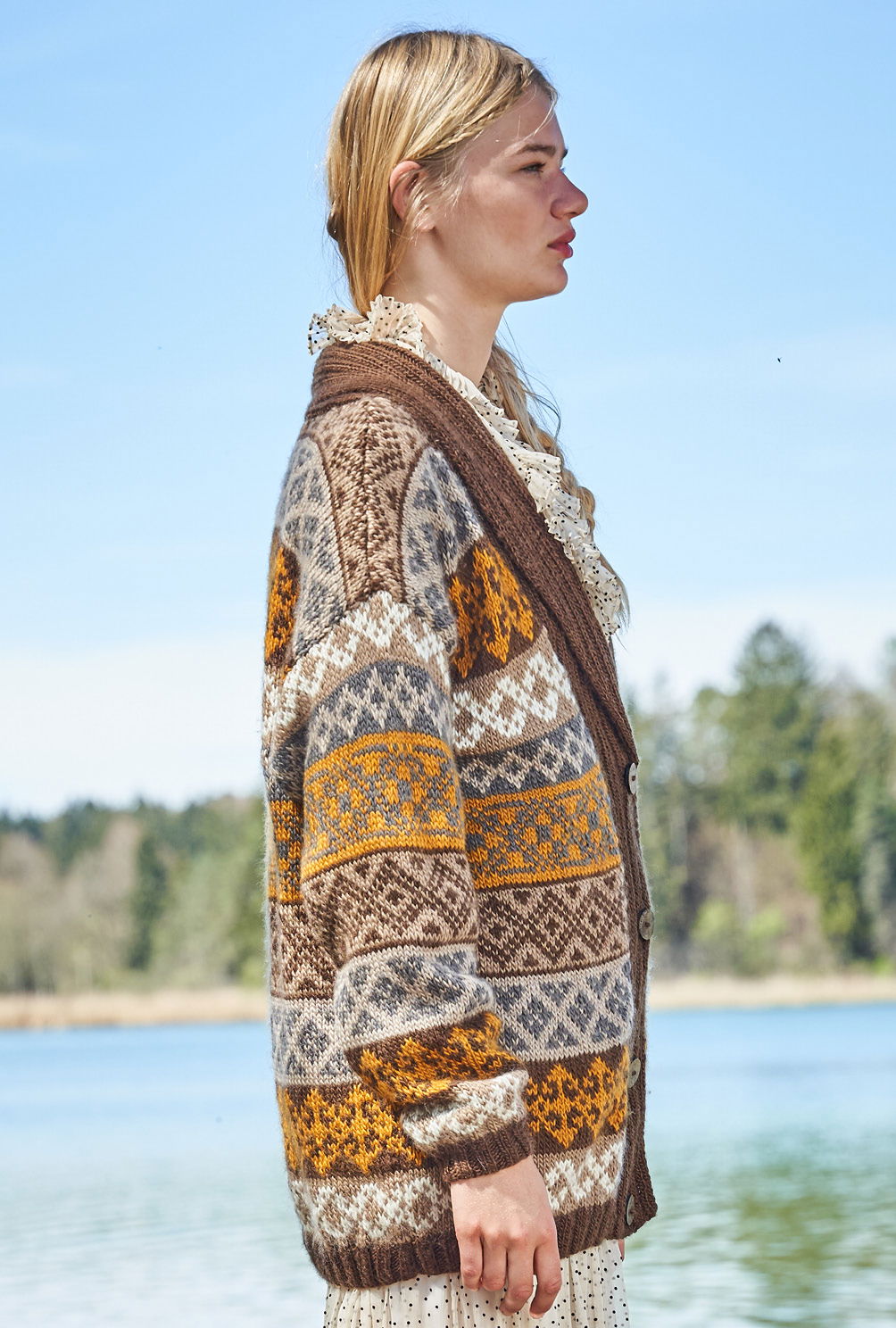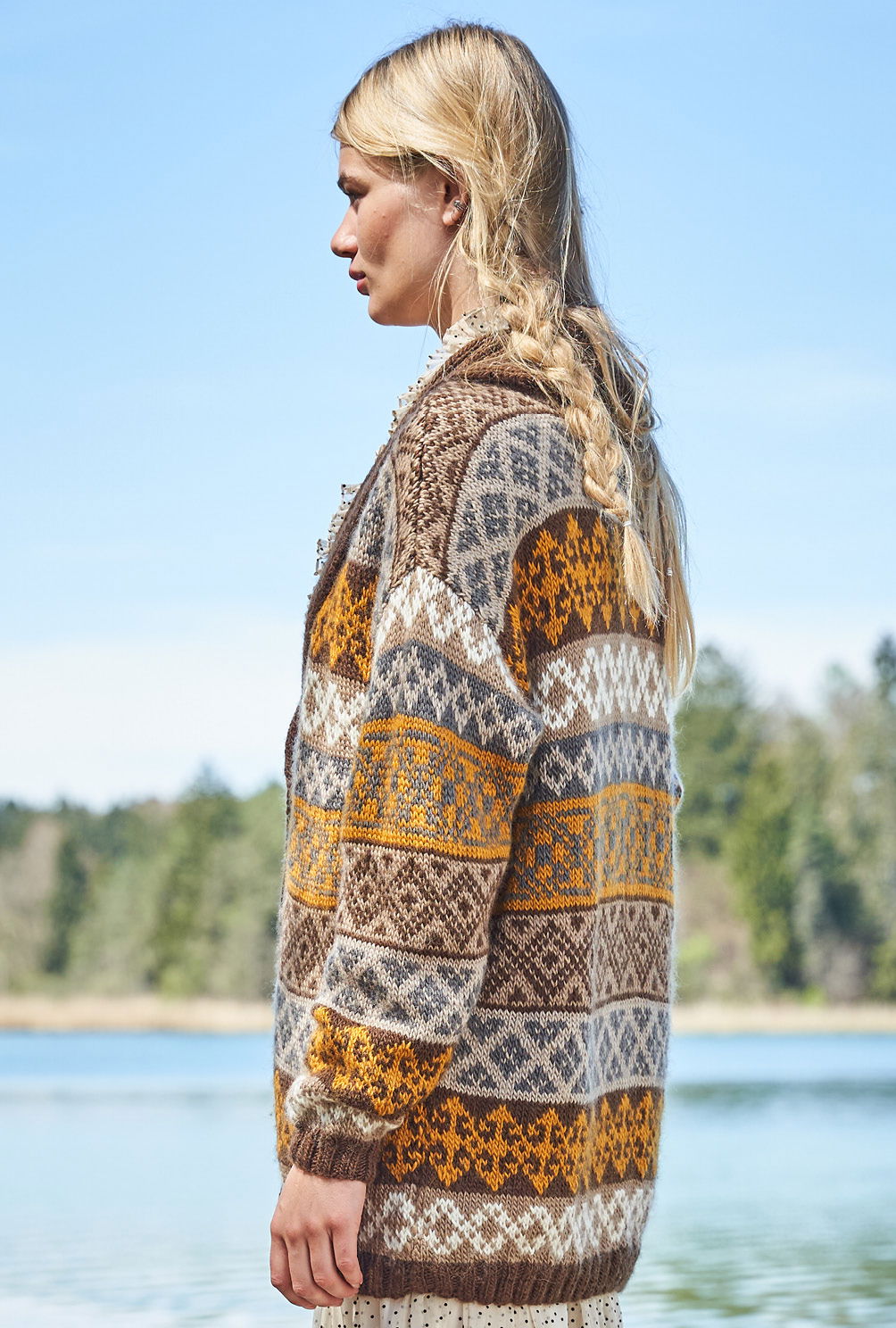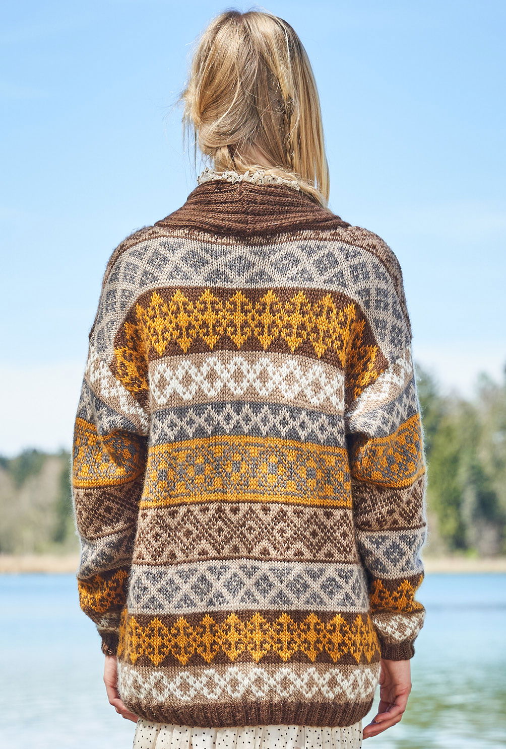 Wie man an dieser prachtvollen Jacke sieht, lohnt es immer, sich näher mit dem Thema Jacquardmuster zu befassen. Eigentlich ist es gar nicht so schwer: Beide Fäden über den Zeigefinger bzw. über Zeige- und Mittelfinger laufen lassen oder einen Faden links, den anderen rechts führen – wer keine Erfahrung mit dem Stricken von Jacquardmustern hat, sollte bei dieser grandiosen Schalkragen-Jacke die verschiedenen Techniken vorher ausprobieren, dann geht die Arbeit umso schneller von der Hand. Denn bedingt durch die kleineren Rapporte ist das hier verwendete Muster durchaus auch prima, für (noch) nicht so ganz versierte Mehrfarb-Stricker*innen. Die klare und farbige Strickschrift hilft zudem dabei, stets den Überblick zu behalten. Begonnen wird mit dem Rückenteil, dann folgen die beiden Vorderteile, zum Schluss die Ärmel. Ist alles fertig, werden noch die Blenden mit dem Schalkragen gestrickt, die Nähte geschlossen und der Schalkragen angenäht.