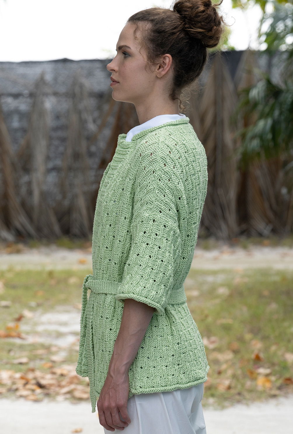 Sportliche Looks sind nach wie vor sehr lässig, aber etwas körperbetonter. Bei der hellgrünen Jacke dient ein Strickgürtel als Verschluss. Er wird vorne verknotet und bringt alles schön auf Taille. Was man erst auf den zweiten Blick erkennt: Im zweifädig gearbeiteten Strukturmuster blitzen hier und da silberne Glanzlichter. Dabei handelt es sich um ein Baumwollgarn, das mit Lurexfasern angereichert ist – ein toller Effekt, der die elegante Note erzeugt.