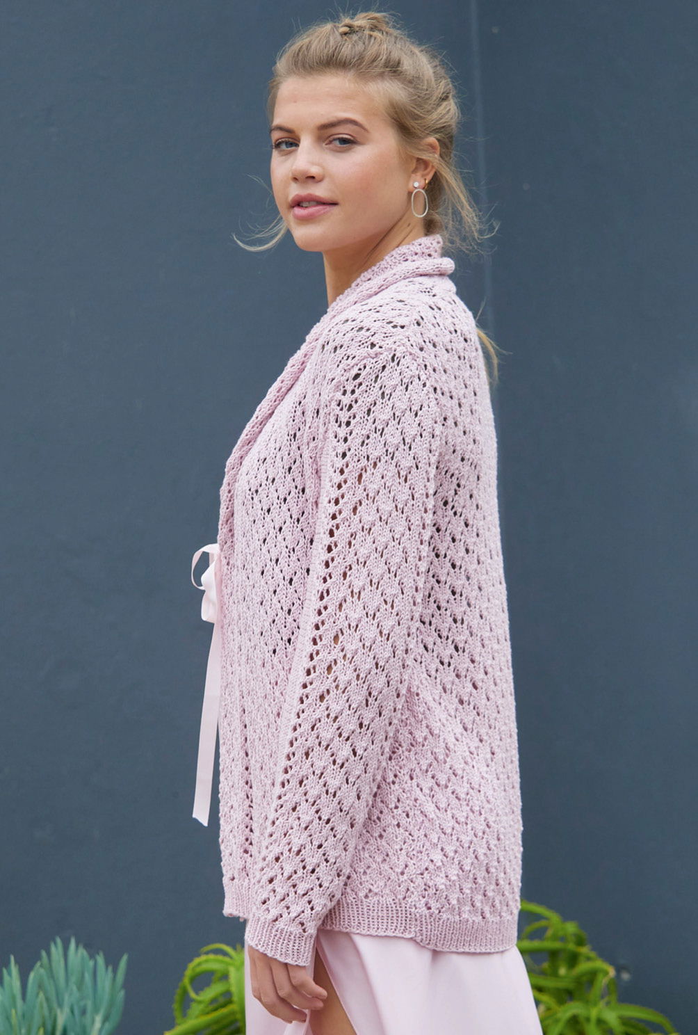 Bei dieser hüftlangen roséfarbenen Jacke aus 100 % Baumwolle läuft das einfache Ajourmuster auch im Schalkragen weiter. Automatisch rollt sich die Außenkante des Schalkragens leicht auf, was einen zusätzlich schicken Effekt ergibt. Ein sehr feminines Modell, das auch zu festlichen Anlässen gut passt. Die Ärmel sind klassisch mit Armkugel geschnitten, auf diese Weise sitzt die Jacke an den Schultern perfekt. Als Verschluss wird ein rosafarbenes Ripsband eingesetzt, die Höhe kannst du individuell festlegen. Die Anleitung hierfür steht in den Größen 36/38, 40/42 und 44/46 zur Verfügung.