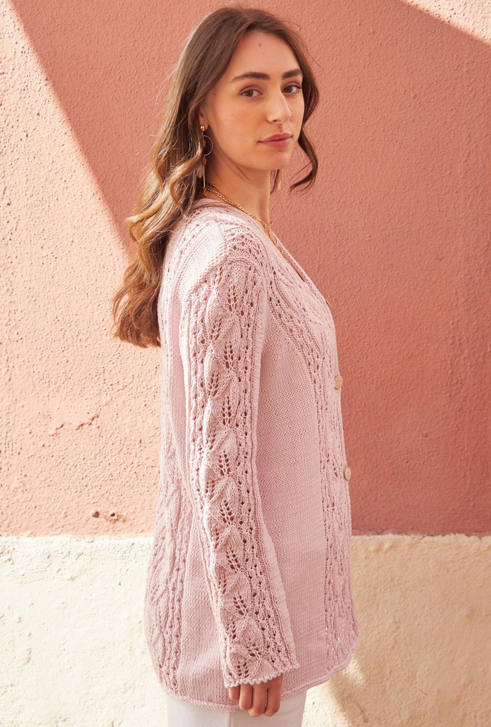 Der Cardigan aus malvenfarbener Bio-Baumwollgarn begeistert mit seinen breiten Blattmusterstreifen mit seitlichen Lochmusterranken. Dadurch liegt der Fokus auf dem Mittelteil, während die glatt rechts gestrickten Flächen und der lang, nach unten hin offene Schnitt der Jacke für eine schmale Silhouette sorgen. Lediglich drei Knöpfe schließen die Jacke, so dass die Vorderteile locker auseinanderfallen. Durch die Ärmel mit Armkugel sitzt die Schulterpartie perfekt. Der gesamte Jackenrand bekommt am Schluss noch eine I-Cord-Blende. Die Anleitung gibt es für die Größen 38/40, 42/44 und 46/48.