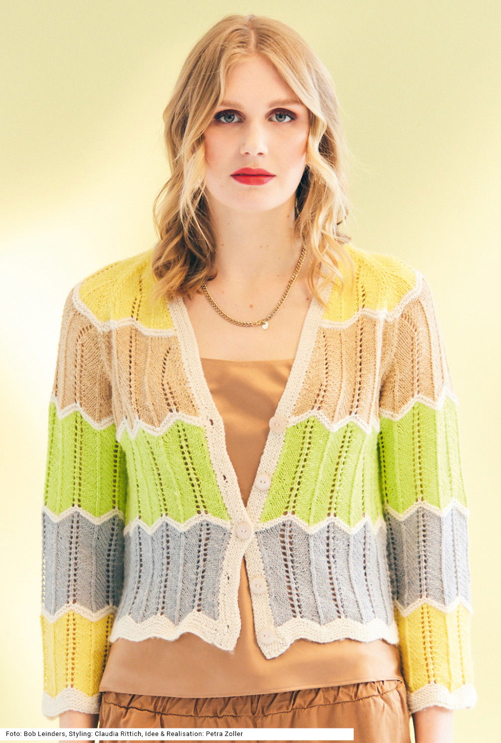 Sabrina Strickjournal Jacke mit Ajour-Blockstreifen in Weiß, Grün, Grau, Beige und Gelb