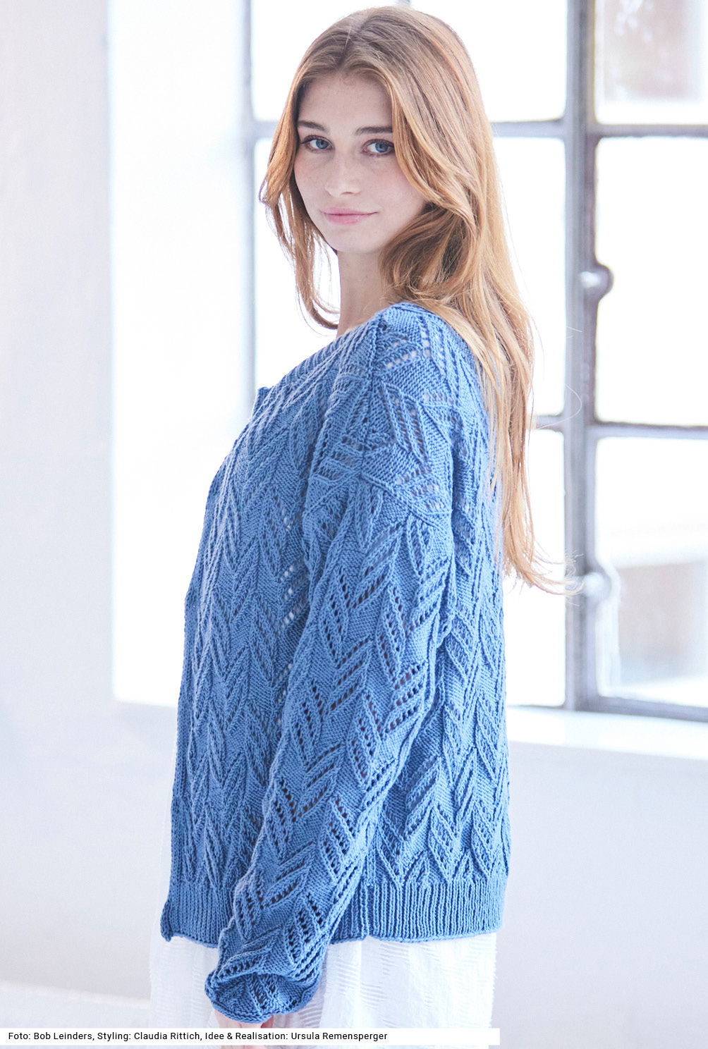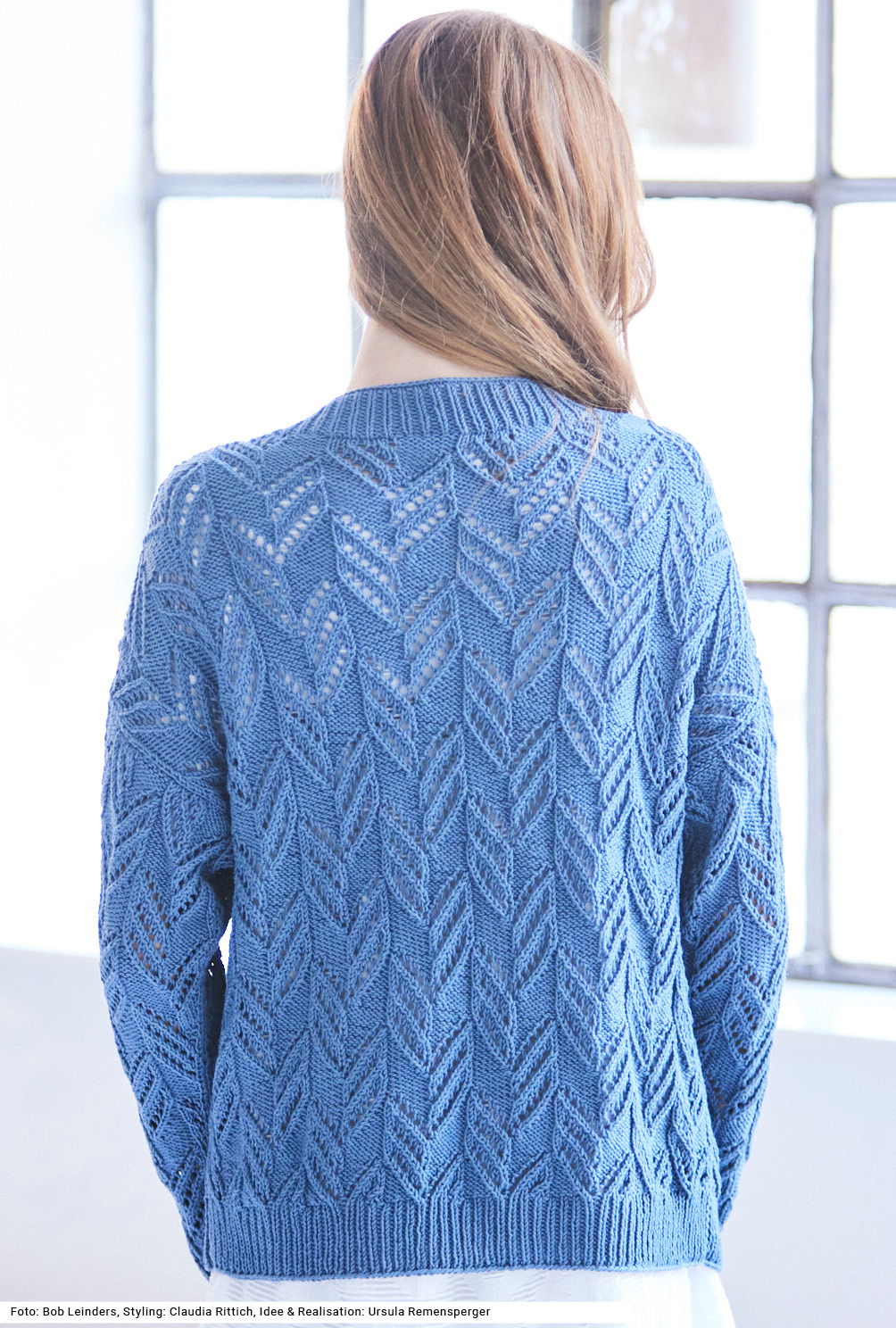 Ein rankenartiges Ajourmuster verziert die Jacke, die mit innenliegenden Druckknöpfen geschlossen wird. Der Saumrand und die Blende am etwas tieferen, runden Halsausschnitt sind im 1/1-Rippenmuster gearbeitet. Hübsches Detail: Die letzte Reihe der Ausschnittblende wird glatt rechts gestrickt und rechts abgekettet. Die Vorderteile bekommen jeweils einen I-Cord-Rand, an dessen Rückseite die Druckknöpfe angenäht sind. Die Ärmel enden ganz gerade – das erleichtert das Einnähen. Das Garn aus Baumwolle und Polyacryl kann in der Maschine gewaschen werden. Eine Anleitung gibts für die Größen 38/40, 42/44 und 46/48.