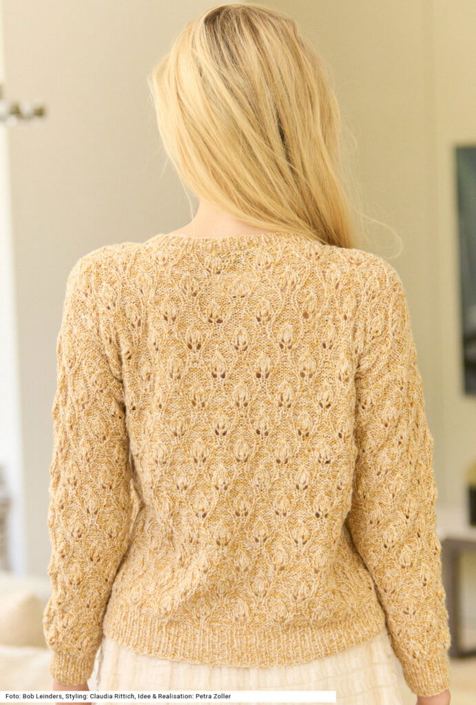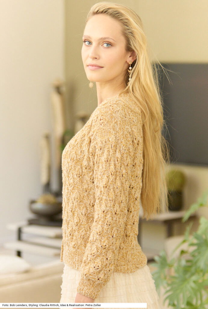 Wenn sich ein federleichtes und ein glänzendes Garn vereinen, sprich doppelfädig verstrickt werden, dann kommt ein zartes Modell mit luxuriösem Charakter zustande. Dazu tragen auch die dezent schimmernden Perlmuttknöpfe bei. Auch das knospenartige Ajourmusters passt perfekt zu diesem Look und kann anhand der Strickschrift leicht erlernt werden. Die Bündchen und die Vorderteilblenden werden im Rippenmuster gestrickt. Eine Anleitung für einmal ein Garn aus Schurwolle, Baumwolle und Kaschmir und zum anderen eines aus Viskose und Lurex steht für eine Jacke in den Größen 36/38, 42/44 und 48/50 zur Verfügung.