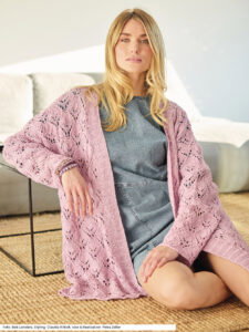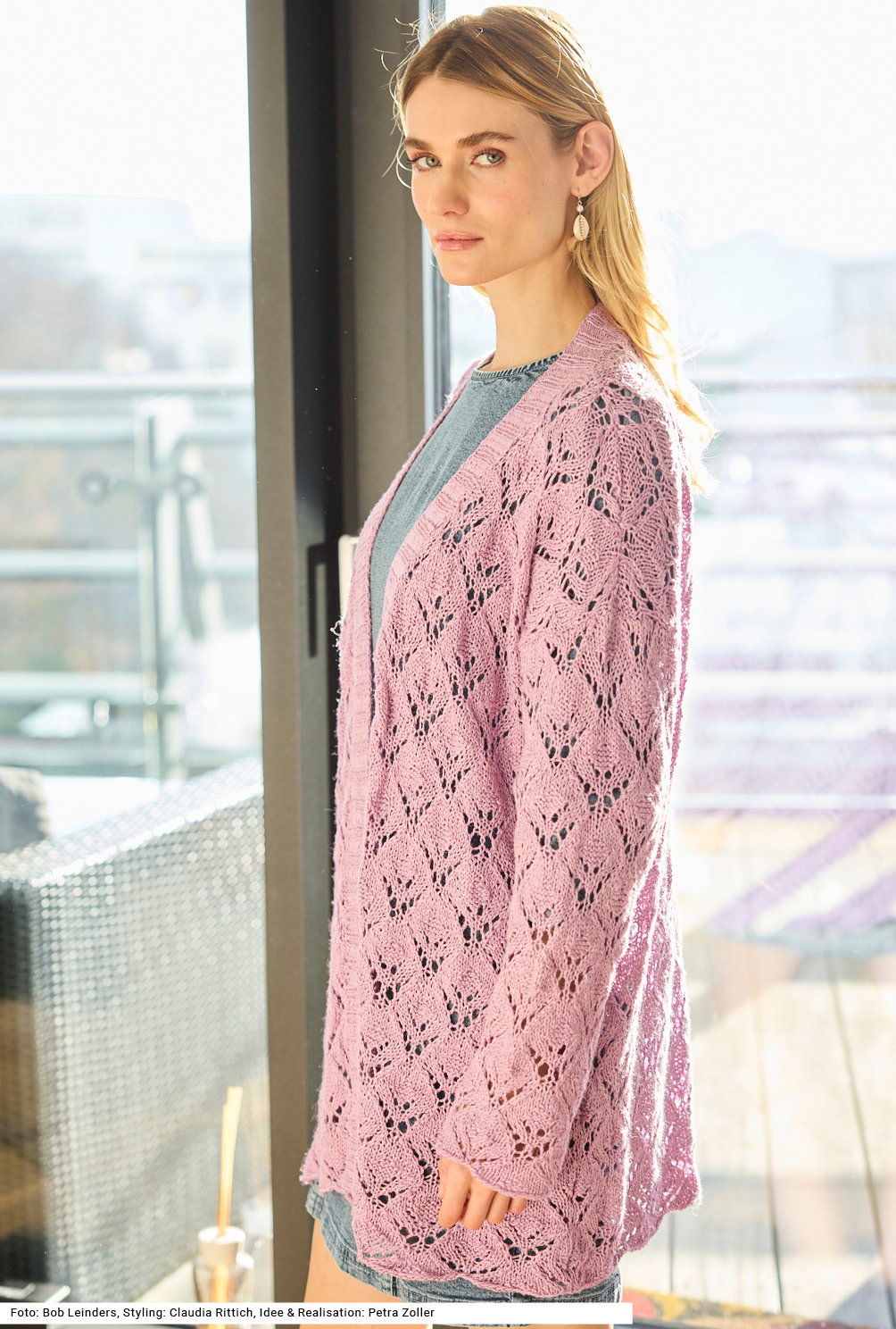 Eine verschlusslose, bequeme Jacke, die aus einem außergewöhnlichen Material gestrickt wird – das Garn besteht aus Lyocell (Viskose) und Ananasfaser. Optisch garantiert das Ajourmuster Leichtigkeit, während die Rippenblende, nur entlang der Vorderteile und dem rückwärtigen Halsausschnitt verlaufend, eine klare Kontur setzt. Für das Ajourmuster werden auch in den Rückreihen Maschen verschieden zusammengestrickt, da heißt es konzentriert arbeiten. Ein gerader Schnitt und ein tiefer V-Ausschnitt lassen viele Möglichkeiten offen für ein passendes Darunter. Eine Anleitung steht für die Größen 38/40, 42/44 und 46/48 zur Verfügung.