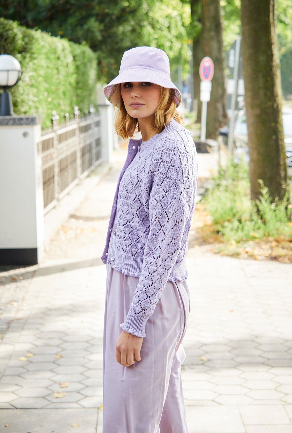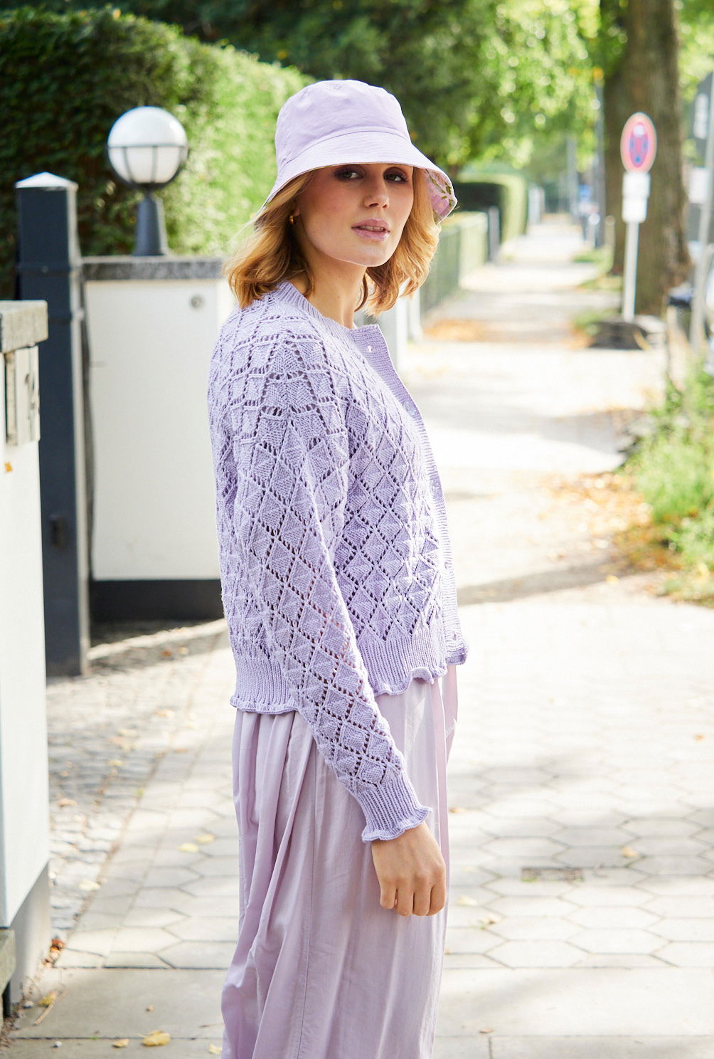 Sabrina Strickjournal Jacke mit Ajourmuster und Rüschen in Flieder