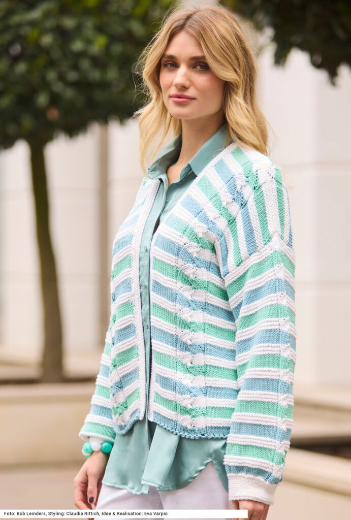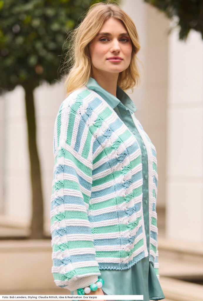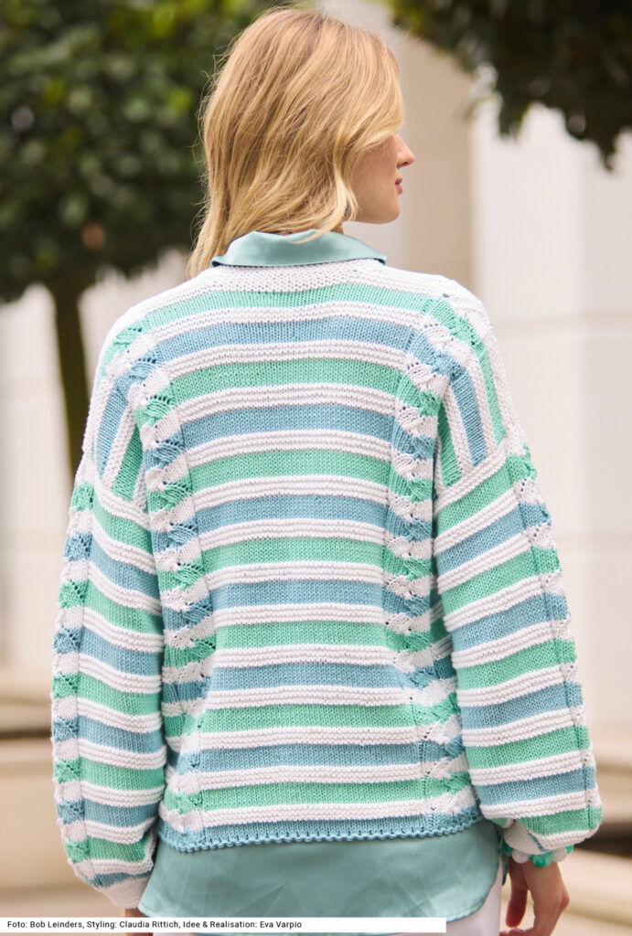 Diese verschlusslose Jacke liebt es dynamisch. Sie vereint ein löchriges, in den Vorderteilen vertikal verlaufendes Zopfmuster mit horizontalen Streifen in glatt rechts in zwei Farbtönen und kraus rechts in immer der selben Farbe. Die Zöpfe verlaufen auch in der Mitte der Ärmel. Alle Teile sind ganz gerade geschnitten. Bei den Ärmel werden nach den kraus rechts gestrickten Bündchen für die opulente Weite Maschen zugenommen. Auch die Vorderteilblenden sind kraus rechts gestrickt. Eine Anleitung für ein Garn aus Baumwolle und Polyacryl gibts für die Größen 38/40, 42/44 und 46/48.