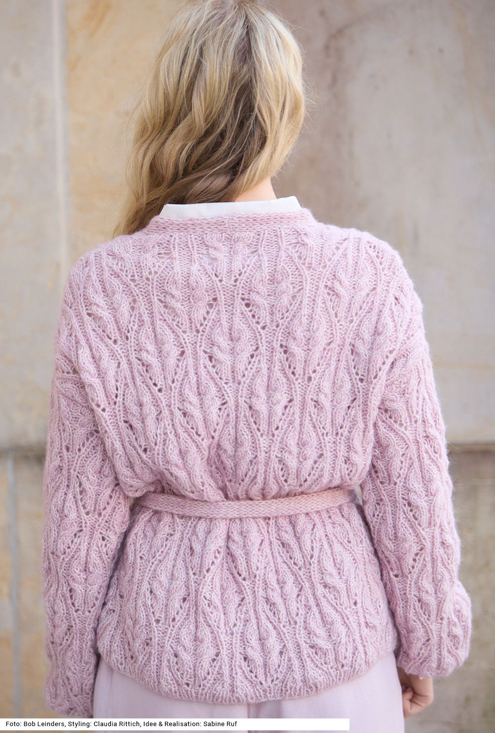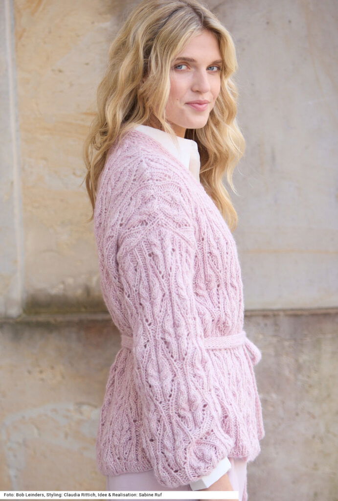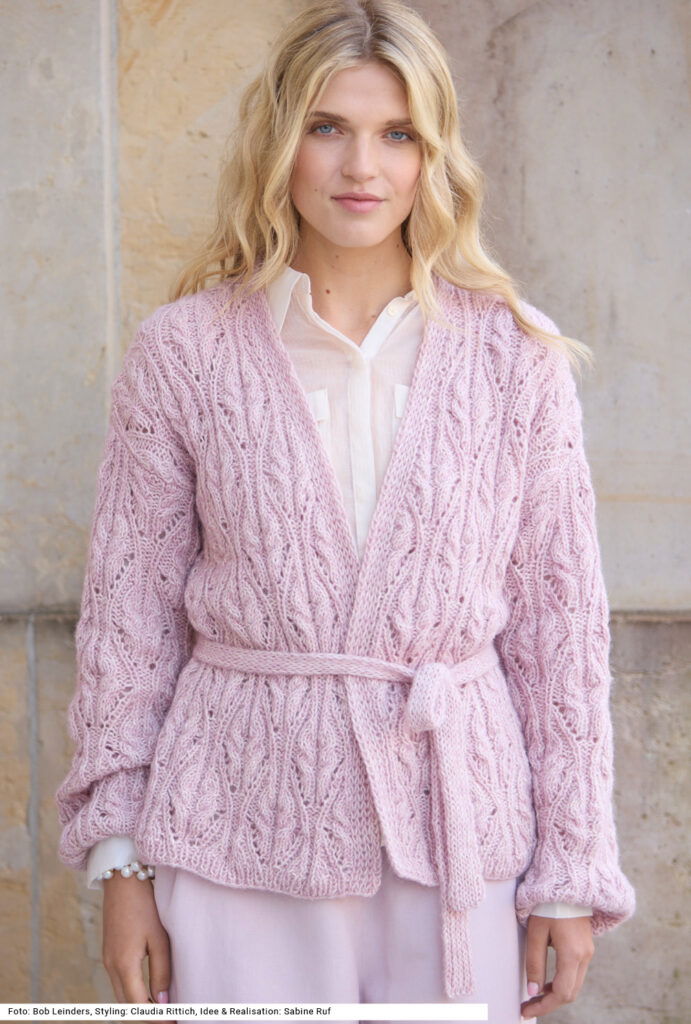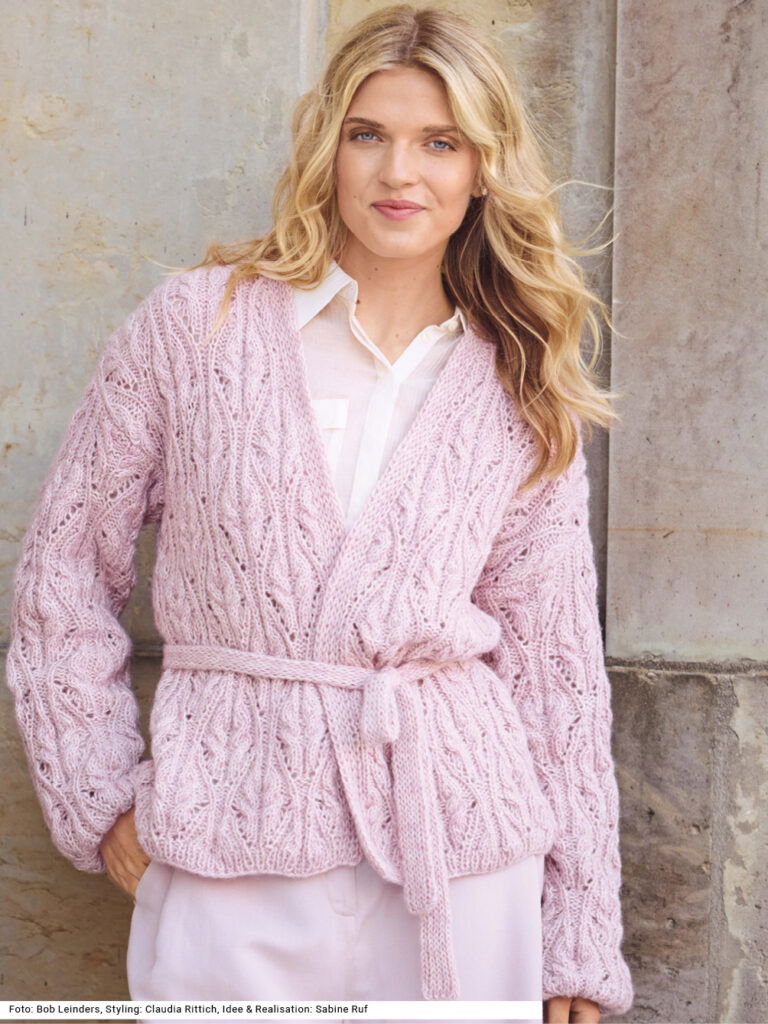 Weich fließend, kraftvoll strukturiert: Diese traumhaft leichte Jacke mit V-Ausschnitt und Gürtel besticht durch kunstvolle Rosenzöpfe, die dem Modell eine faszinierende Plastizität verleihen und durch detailreiche Ränder – an den Bündchen im Rippenmuster, an den verschlusslosen Vorderteilblenden kraus rechts – stilvoll ergänzt werden. Der Bindegürtel ist im Tunnelpatent gearbeitet. Weite gerade geschnittene Ärmel erleichtern das Einnähen und ergeben eine überfallende Schulterpartie. Die Anleitung für ein Garn aus Baumwolle, Alpaka und Schurwolle dazu steht für die Größen 38/40 und 42/44 sowie 46/48 zur Verfügung.