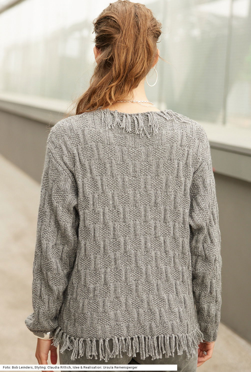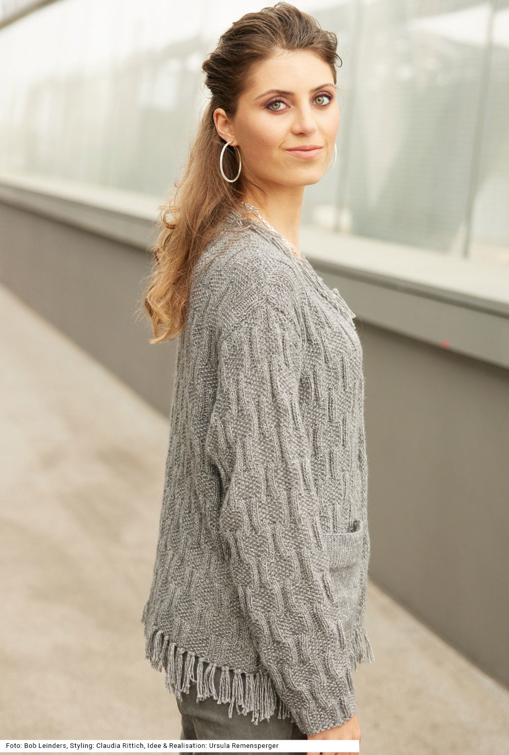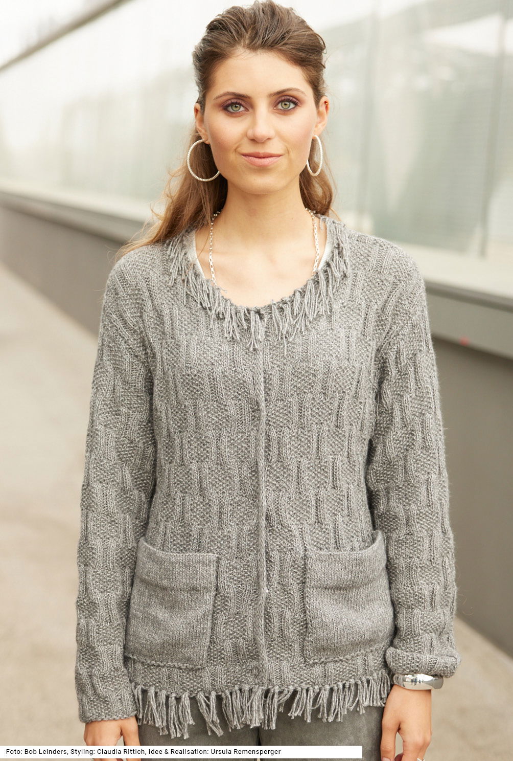 Diese Jacke mit Druckknöpfen ist perfekt für Tage im Office. Die aufgesetzten Taschen werden glatt rechts, ansonsten wird ein Reliefmuster aus rechten und linken Maschen gestrickt. Zunächst muss man aufpassen, dass man die Maschen nicht verwechselt, jedoch mithilfe der Strickschrift ist das kein Problem und nach ein, zwei Höhenrapporten kann man das Muster auswendig. An Saum und Halsausschnitt sind Fransen eingeknüpft. Das graumelierte Garn setzt sich aus Baumwolle, Polyacryl, Polyester, Schurwolle und Viskose zusammen. Für die Größen 38/40, 44/46 und 48/50 gibt es eine Anleitung.